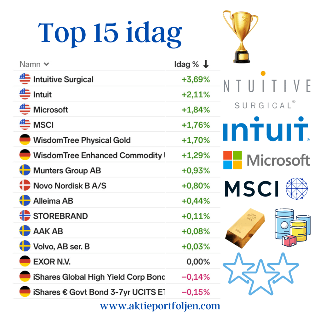 Guldpriset fortsätter att plocka nya rekord. Igår passerade ädelmetallen för första gången 2 350 dollar. Till vinnarkvartetten sällade sig även finansbolaget MSCI fordonsjätten Stellantis som båda gick mot strömmen utan direkta nyheter.