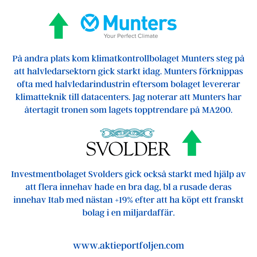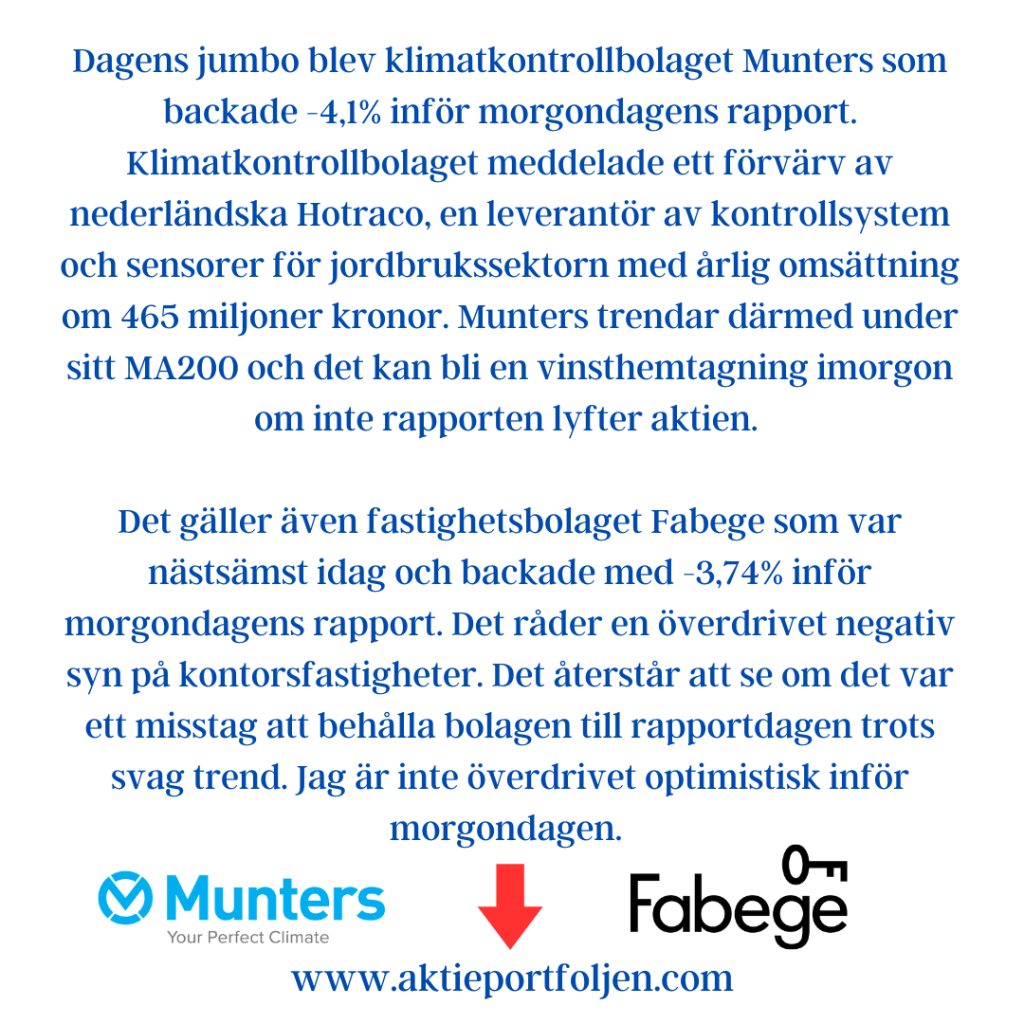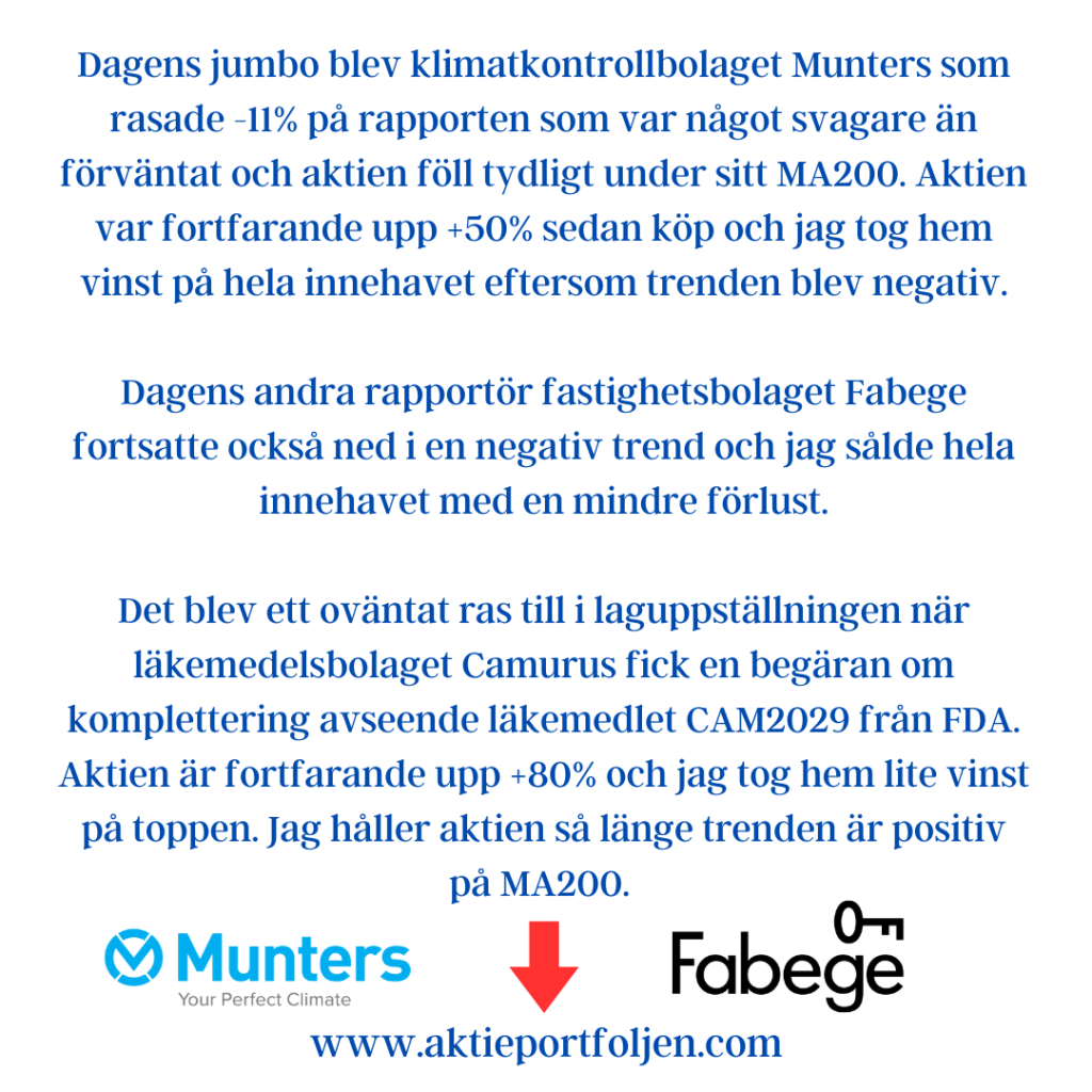 Dagens jumbo blev klimatkontrollbolaget Munters som rasade -11% på rapporten som var något svagare än förväntat och aktien föll tydligt under sitt MA200. Aktien var fortfarande upp +50% sedan köp och jag tog hem vinst på hela innehavet eftersom trenden blev negativ.