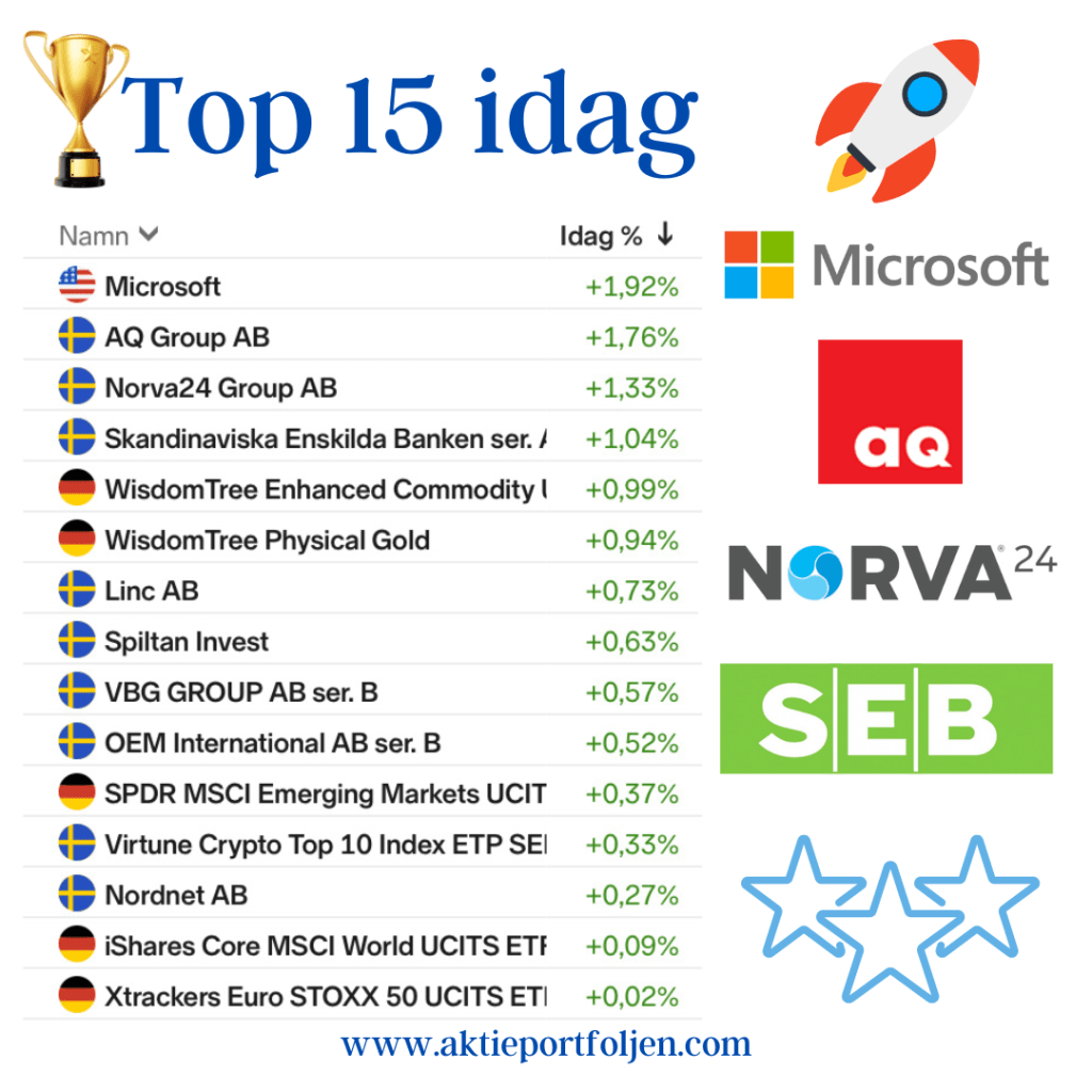 Därefter kom AQ Group (+1,76%), Norva24 (+1,33%) och SEB (+1,04%) som alla steg utan direkta nyheter.