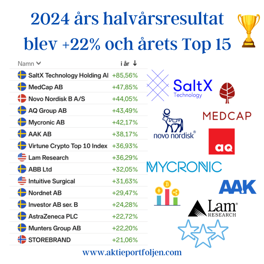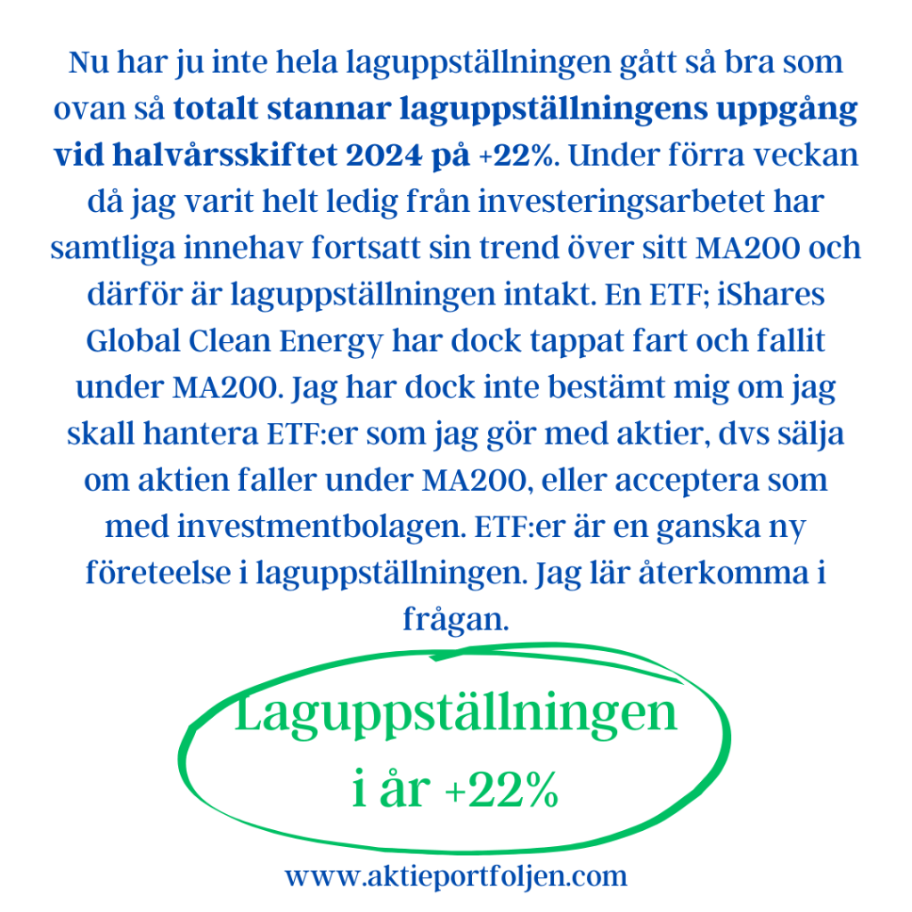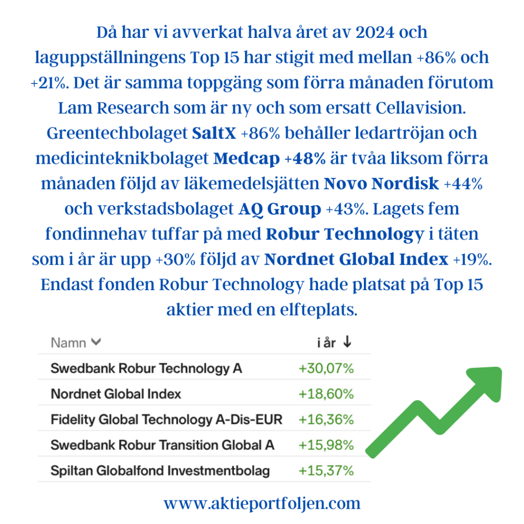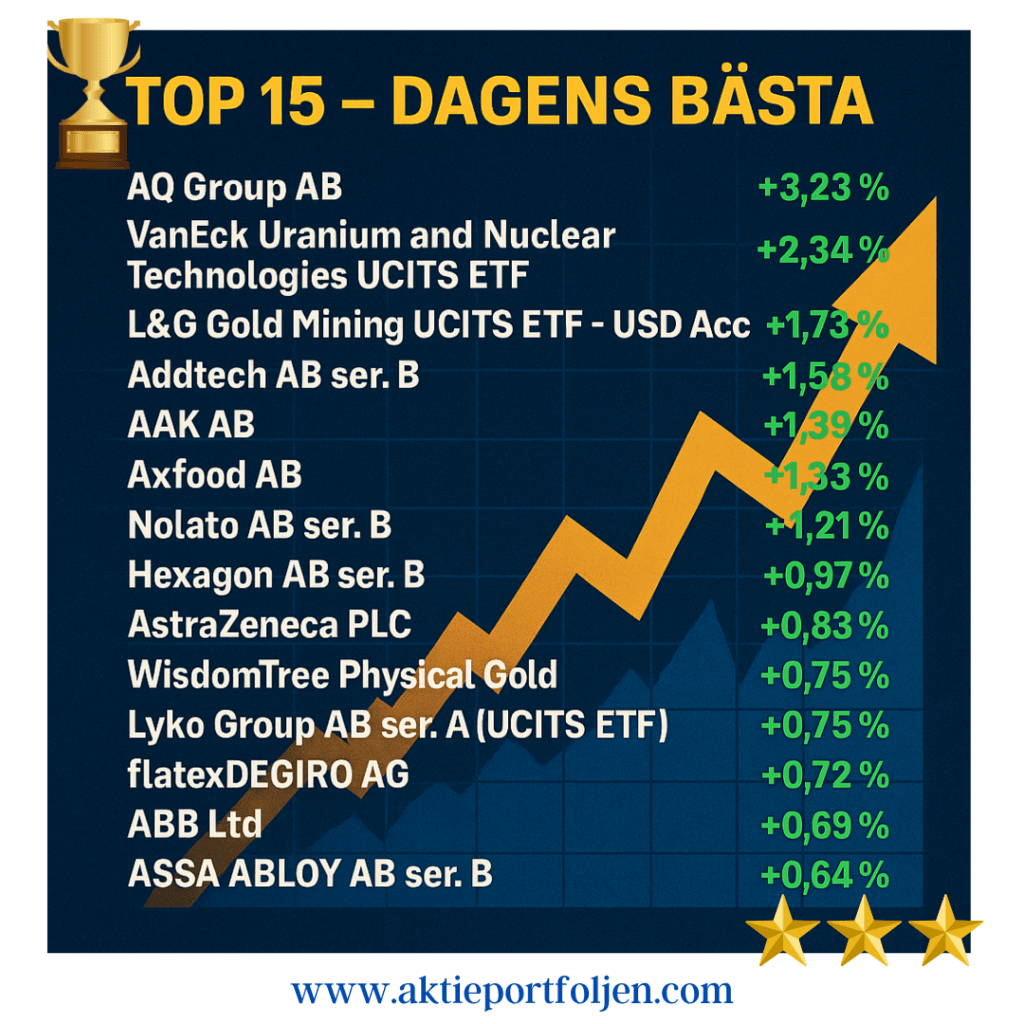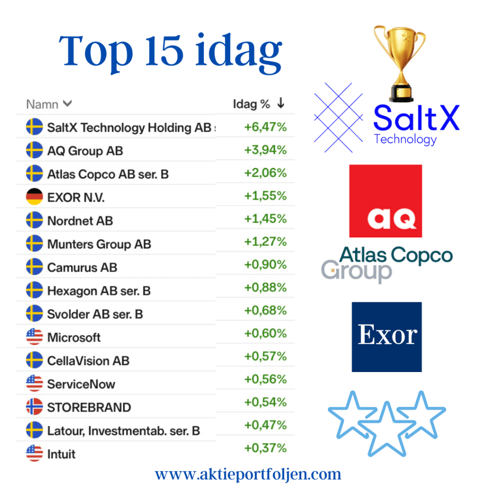 Latour, Investmentab. ser. B +2,24 % flatexDEGIRO SE +2,16 % AQ Group AB +1,86 % Catena AB +1,71 % Lundbergföretagen AB, L E ser. B +1,56 % Axfood AB +1,40 % Xtrackers MSCI World Energy UCITS ETF +1,34 % Xtrackers MSCI World Financials UCITS ETF +1,28 % ASSA ABLOY AB ser. B +1,24 % Spiltan Invest +1,20 % Nordnet AB +0,92 % Cloetta AB ser. B +0,87 % XACT Svenska Småbolag (UCITS ETF) +0,68 % Investor AB ser. B +0,66 % iShares MSCI World Small Cap UCITS ETF +0,45 % iShares DAX UCITS ETF (DE) +0,38 % XACT Sverige (UCITS ETF) +0,26 % Storebrand +0,22 % iShares Core MSCI Japan IMI UCITS ETF +0,19 % Alfa Laval AB +0,15 %