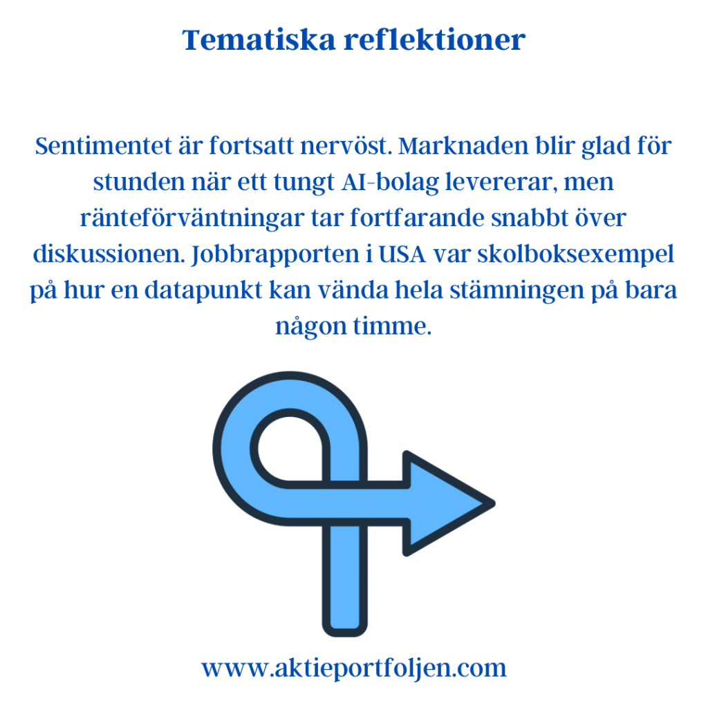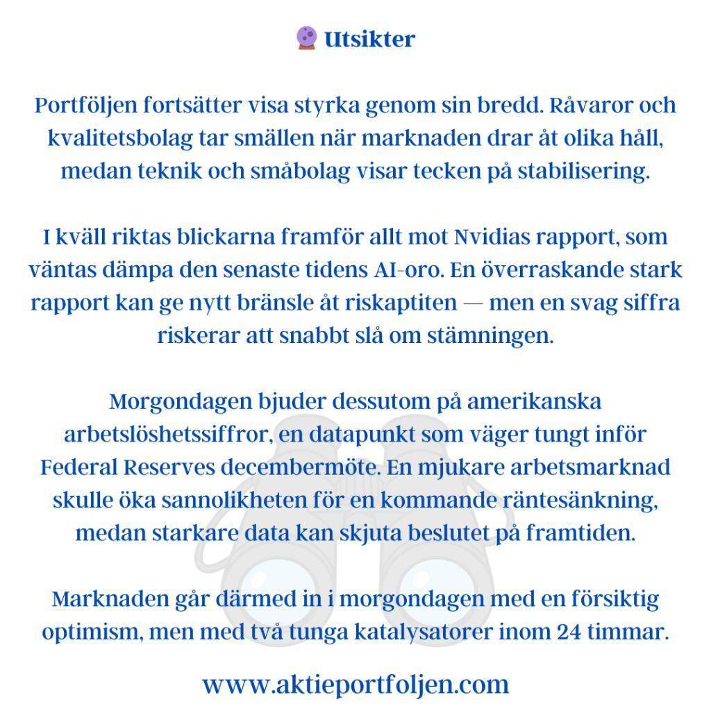 I USA präglades marknaden av väntan – och efterspel – kring rapporten från Nvidia. Bolaget överträffade förväntningarna både vad gäller vinst och omsättning samt guidade för högre intäkter framöver än analytikerkonsensus. Trots detta föll aktien över 4 procent, ett tydligt exempel på hur högt ställda förväntningarna varit inför rapporten. I AI-frossans spår tappade det tekniktunga Nasdaq 100 omkring 1,7 procent, när investerare tog hem vinster i delar av sektorn.