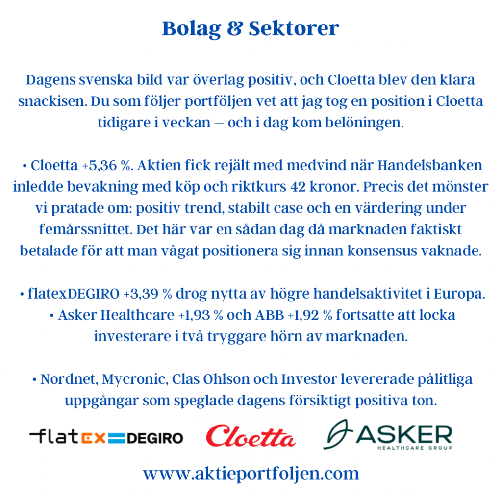 Stödet förstärktes ytterligare av att Latours största innehav, Nederman, steg med över 4 procent under dagen. Även i Nederman har det nyligen förekommit insynsaktivitet, vilket sammantaget bidrog till ett stärkt sentiment kring Latour och en positiv syn på substansvärdet.
