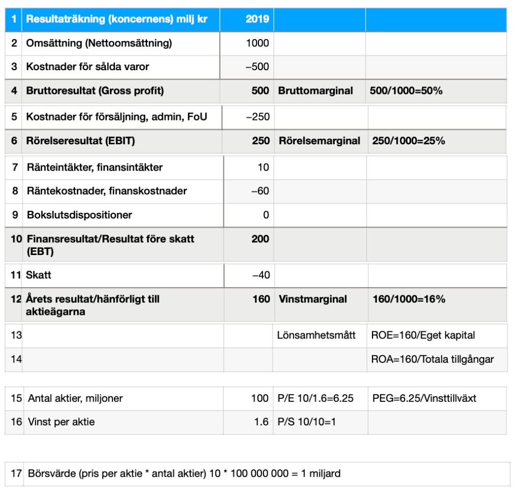 Här har jag gjort ett exempel på hur en resultaträkning är uppbyggd. Det finns en logik i uppställningen och vilka nyckeltal som kan hämtas. Exemplet innehåller fiktiva siffror och är förenklad, men är en bra checklista när jag skall tolka en skarp resultaträkning.
