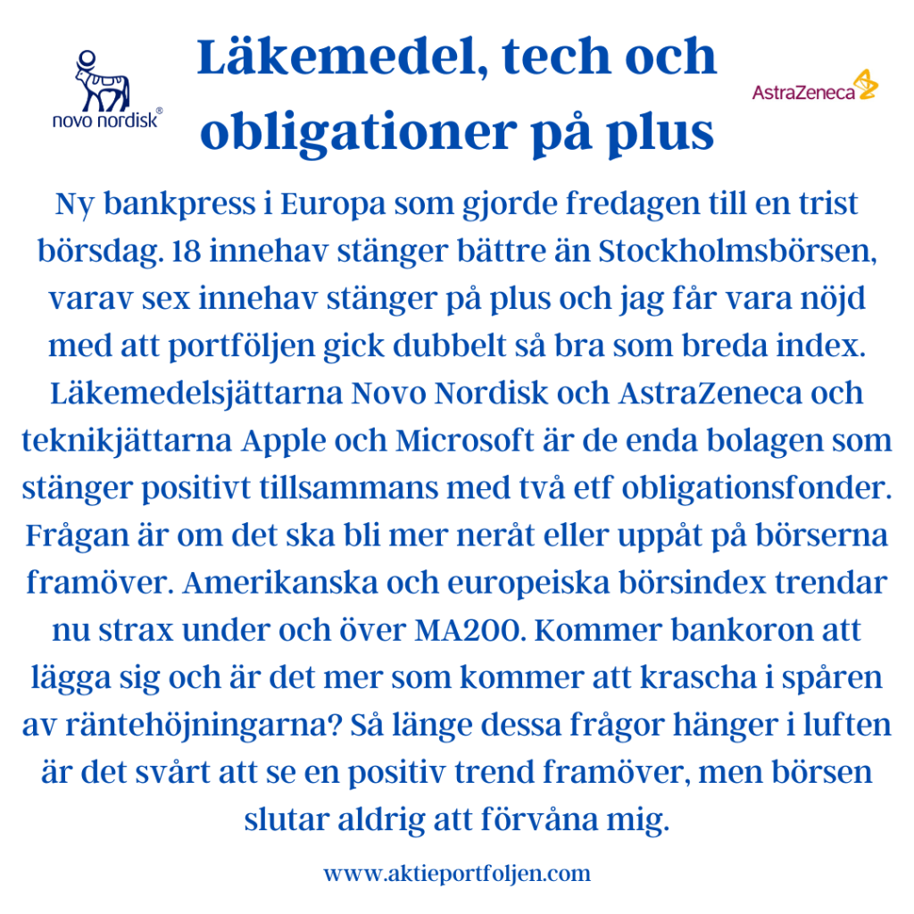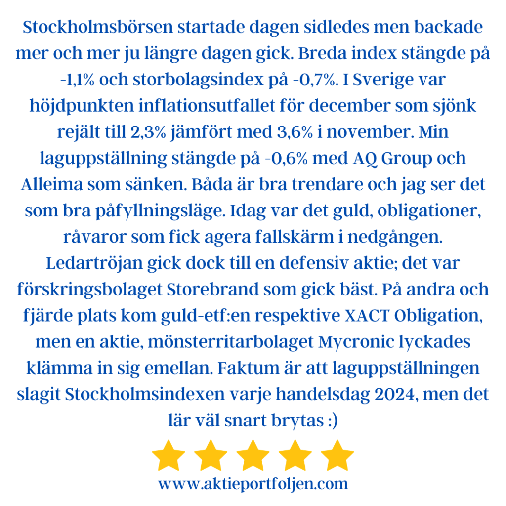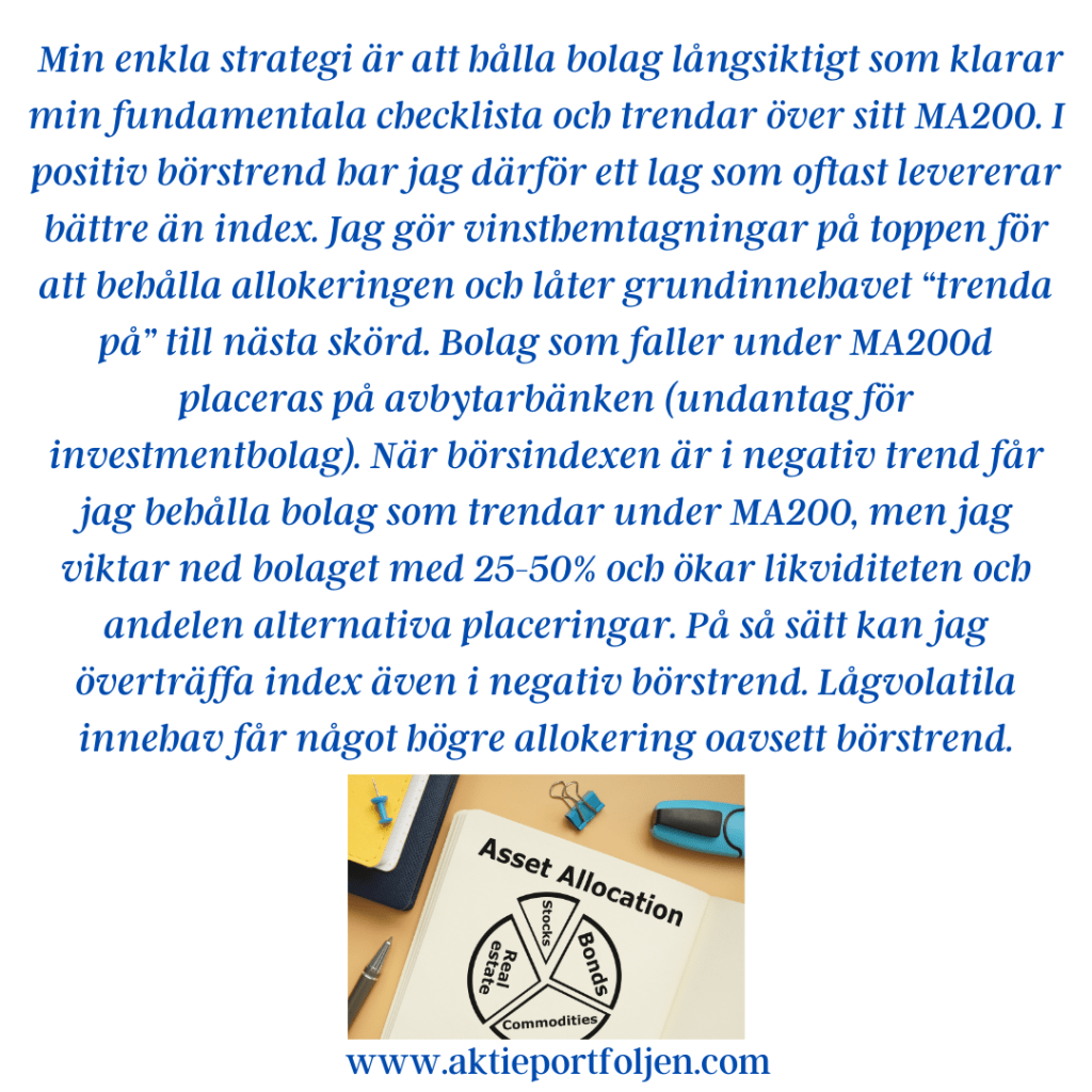 Min enkla strategi är att hålla bolag långsiktigt som klarar min fundamentala checklista och trendar över sitt MA200. I positiv börstrend har jag därför ett lag som oftast levererar bättre än index. Jag gör vinsthemtagningar på toppen för att behålla allokeringen och låter grundinnehavet “trenda på” till nästa skörd. Bolag som faller under MA200d placeras på avbytarbänken (undantag för investmentbolag). När börsindexen är i negativ trend får jag behålla bolag som trendar under MA200, men jag viktar ned bolaget med 25-50% och ökar likviditeten och andelen alternativa placeringar. På så sätt kan jag överträffa index även i negativ börstrend. Lågvolatila innehav får något högre allokering oavsett börstrend.