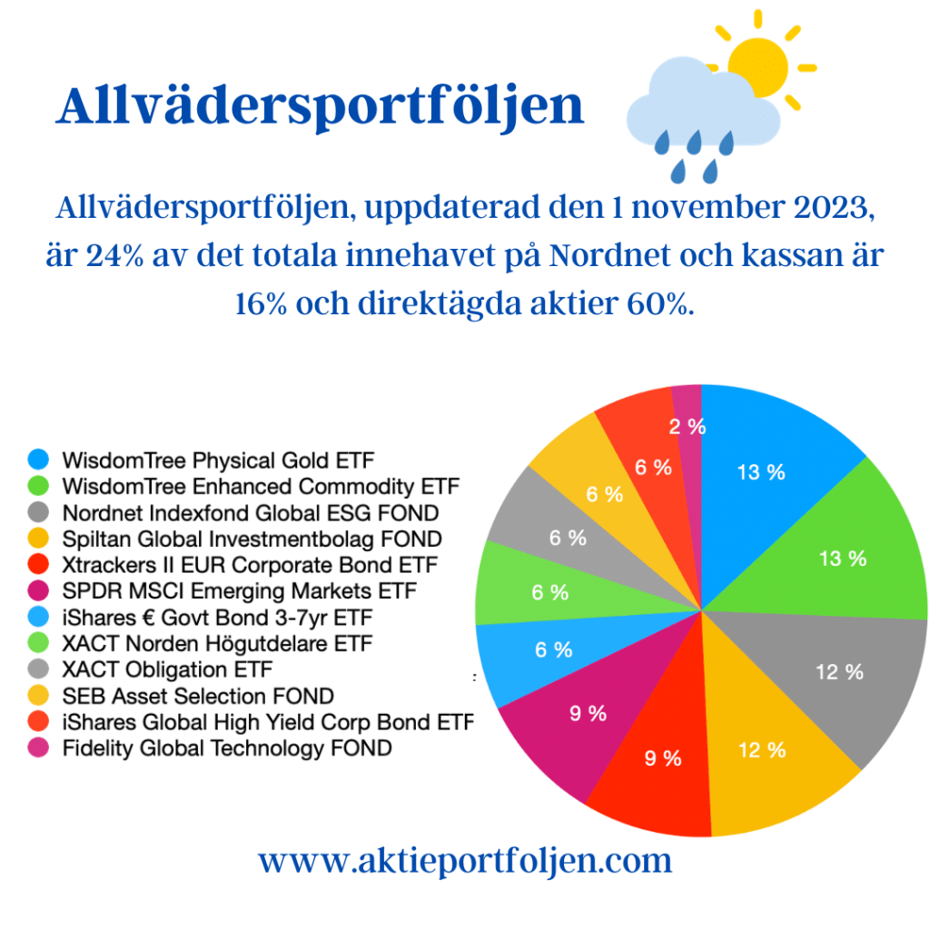 Alternativa placeringar som är 10% av totalen består av etf:er med guld, råvaror och olika obligationer samt kontanter som är avsedda för börsen.