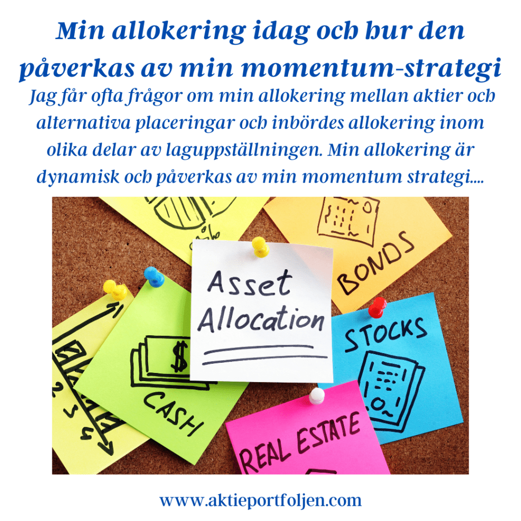 Jag får ofta frågor om min allokering mellan aktier och alternativa placeringar och inbördes allokering inom olika delar av laguppställningen. Min allokering är dynamisk och påverkas av min momentum strategi….