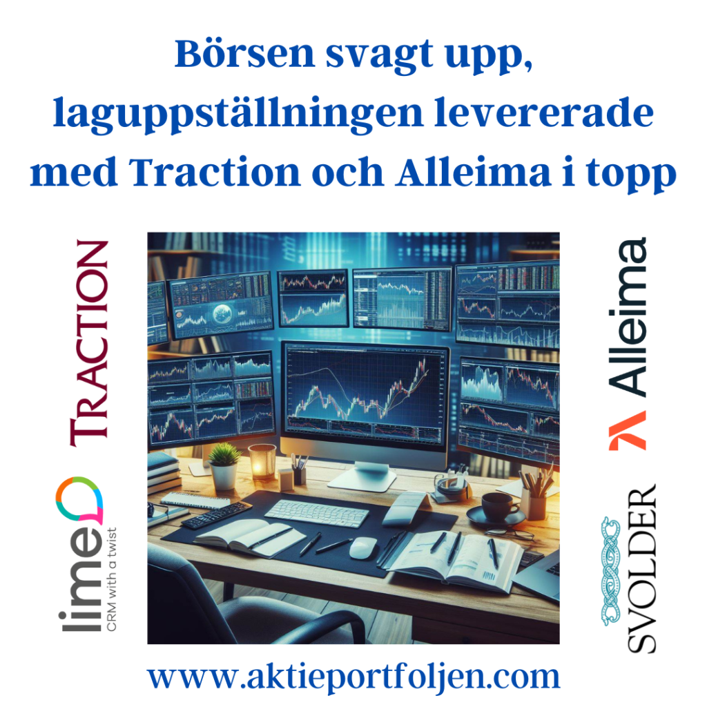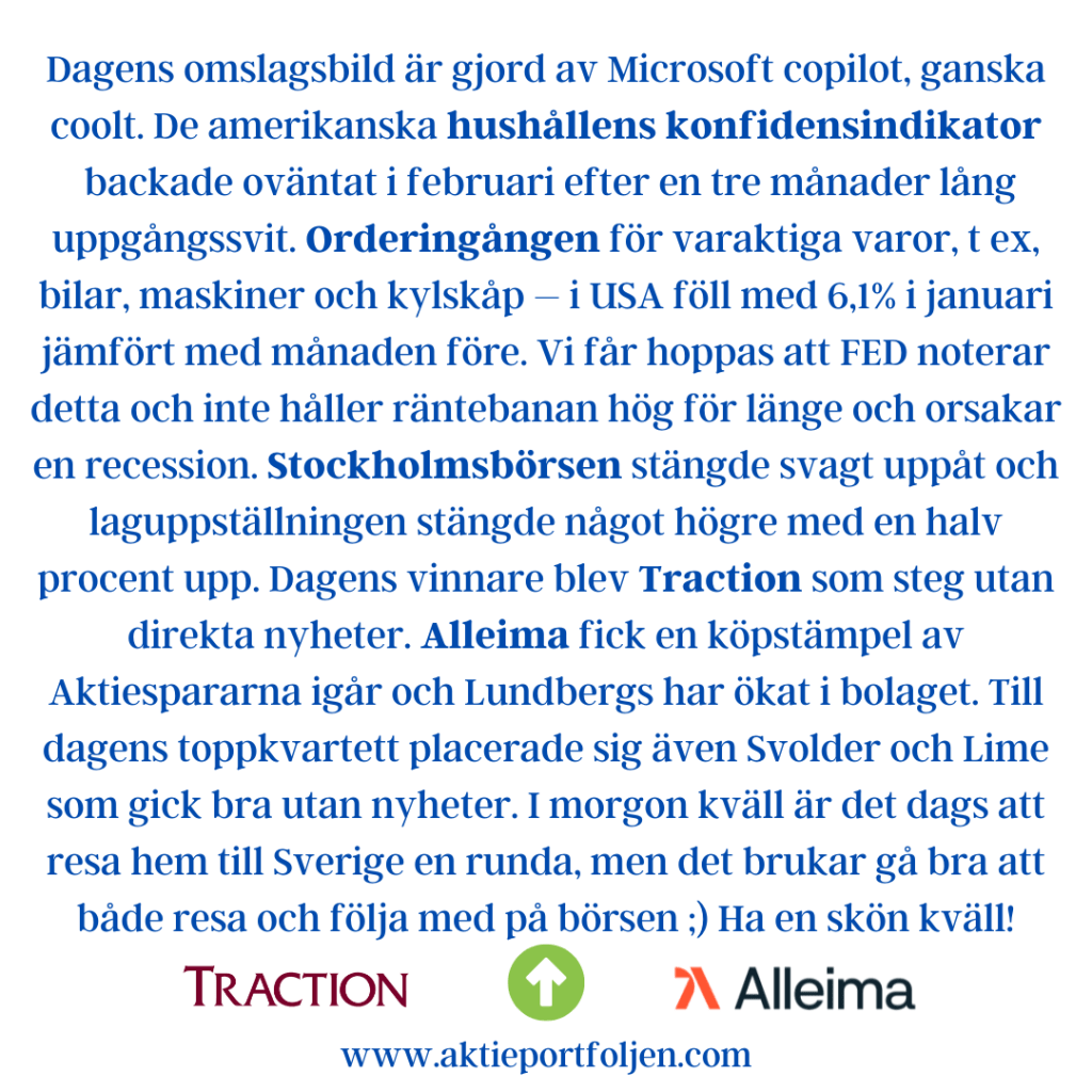 Dagens omslagsbild är gjord av Microsoft copilot, ganska coolt. De amerikanska hushållens konfidensindikatorbackade oväntat i februari efter en tre månader lång uppgångssvit. Orderingången för varaktiga varor, t ex, bilar, maskiner och kylskåp – i USA föll med 6,1% i januari jämfört med månaden före. Vi får hoppas att FED noterar detta och inte håller räntebanan hög för länge och orsakar en recession. Stockholmsbörsen stängde svagt uppåt och laguppställningen stängde något högre med en halv procent upp. Dagens vinnare blev Traction som steg utan direkta nyheter. Alleima fick en köpstämpel av Aktiespararna igår och Lundbergs har ökat i bolaget. Till dagens toppkvartett placerade sig även Svolder och Lime som gick bra utan nyheter. I morgon kväll är det dags att resa hem till Sverige en runda, men det brukar gå bra att både resa och följa med på börsen 😉 Ha en skön kväll!