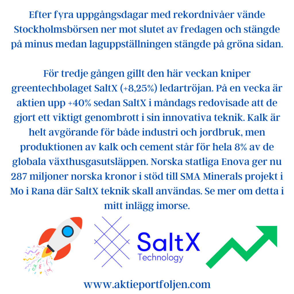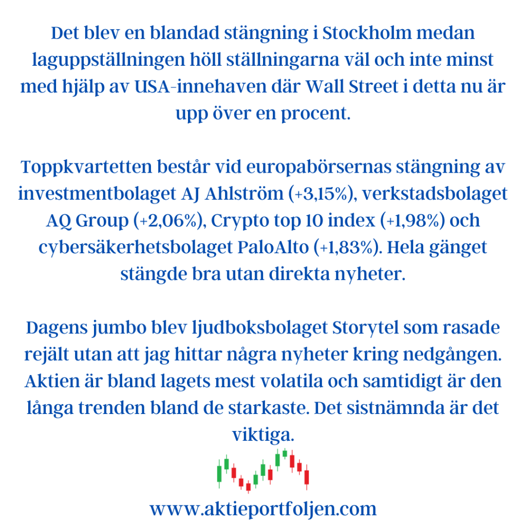 Kassan är nu på rekordhöga 33,4% inklusive obligationer och räntor. Under rådande geopolitiska osäkerhet plockar jag inte in några nya bolag på planen när något bolag får lämna planen när aktien faller under MA200, men jag låter de bolag och etf:er som är de bästa trenderna löpa på och ibland fyller jag på när trenden bekräftas. Det är fördel Sverige och Europa.