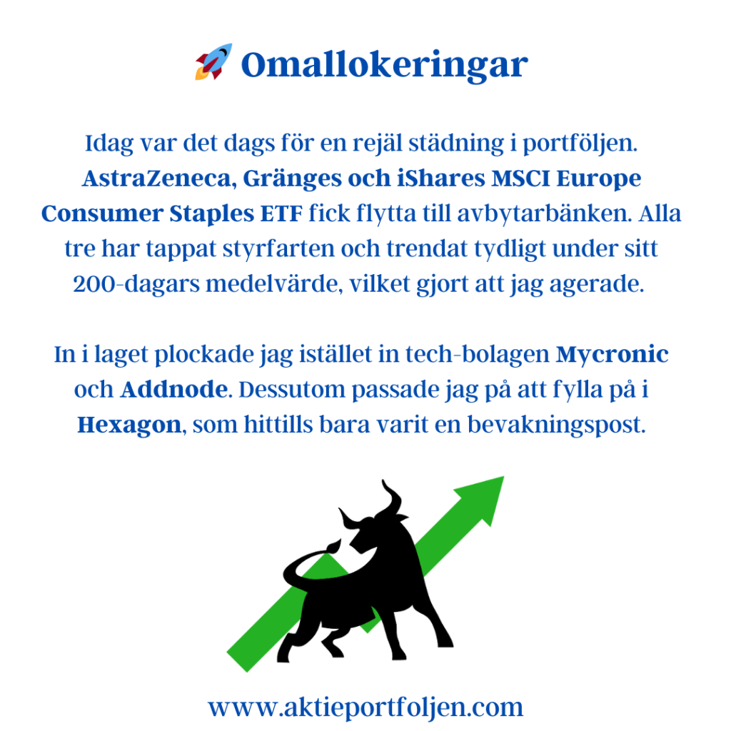Efter flera dagar av nedgångar har några innehav brutit under sitt 200-dagars medelvärde och fått minskad allokering enligt regelboken. Samtidigt har starka trendare fyllts på.