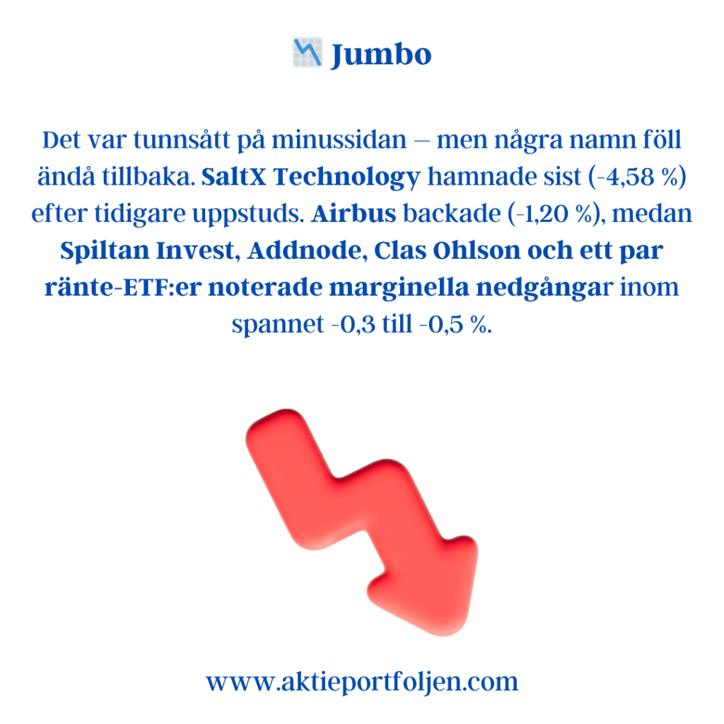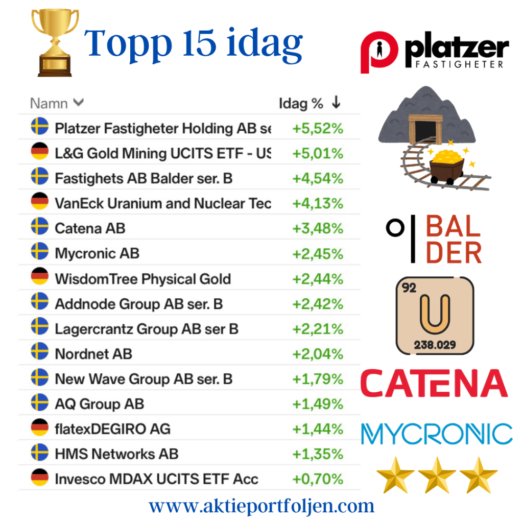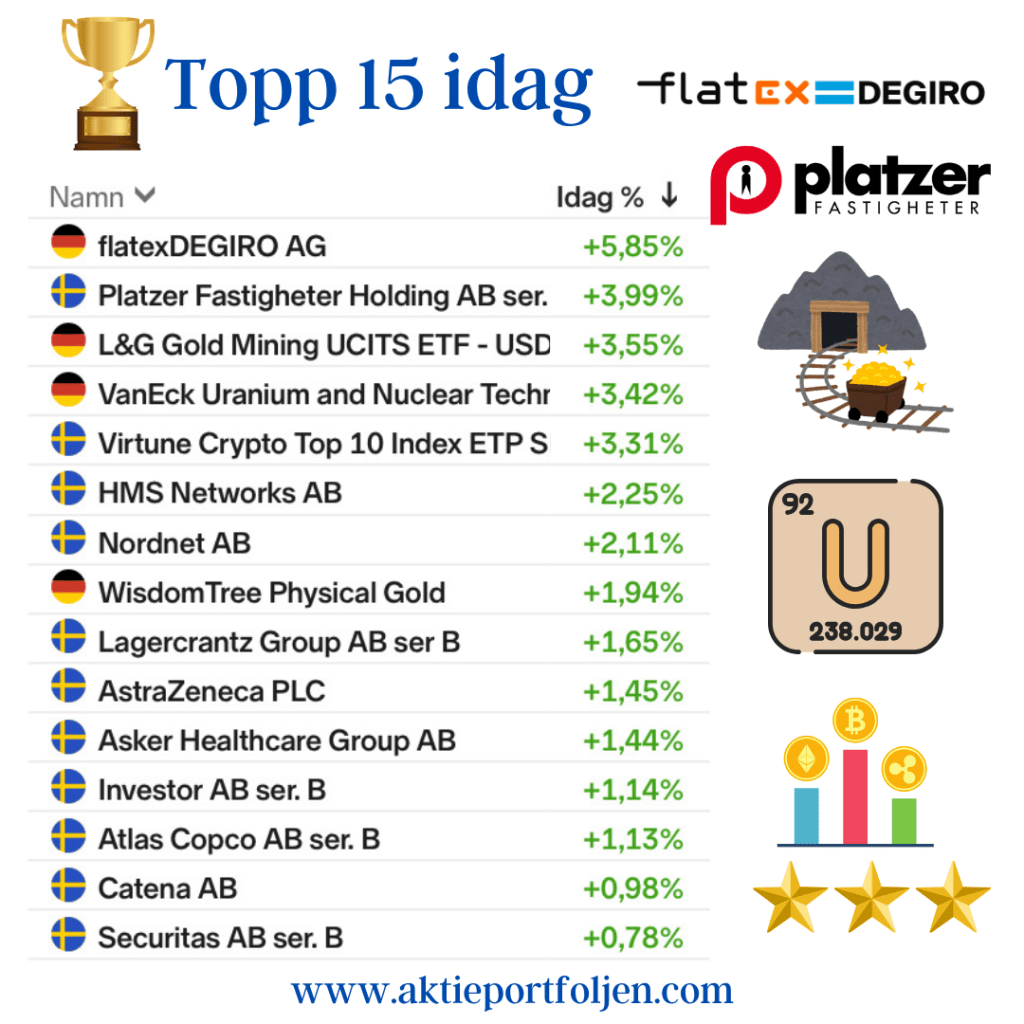 Clas Ohlson +3,1 % Securitas +2,7 % Platzer +2,1 % Catena +0,7 % Axfood +0,6 % Latour +0,6 % AstraZeneca +0,5 % WisdomTree Physical Gold +0,5 % Balder +0,4 % Spiltan Invest +0,3 % Storebrand +0,1 % Hexagon 0,0 % iShares € Govt Bond 3–7 yr −0,0 % Global High Yield ETF −0,0 % XACT Obligation −0,1 %