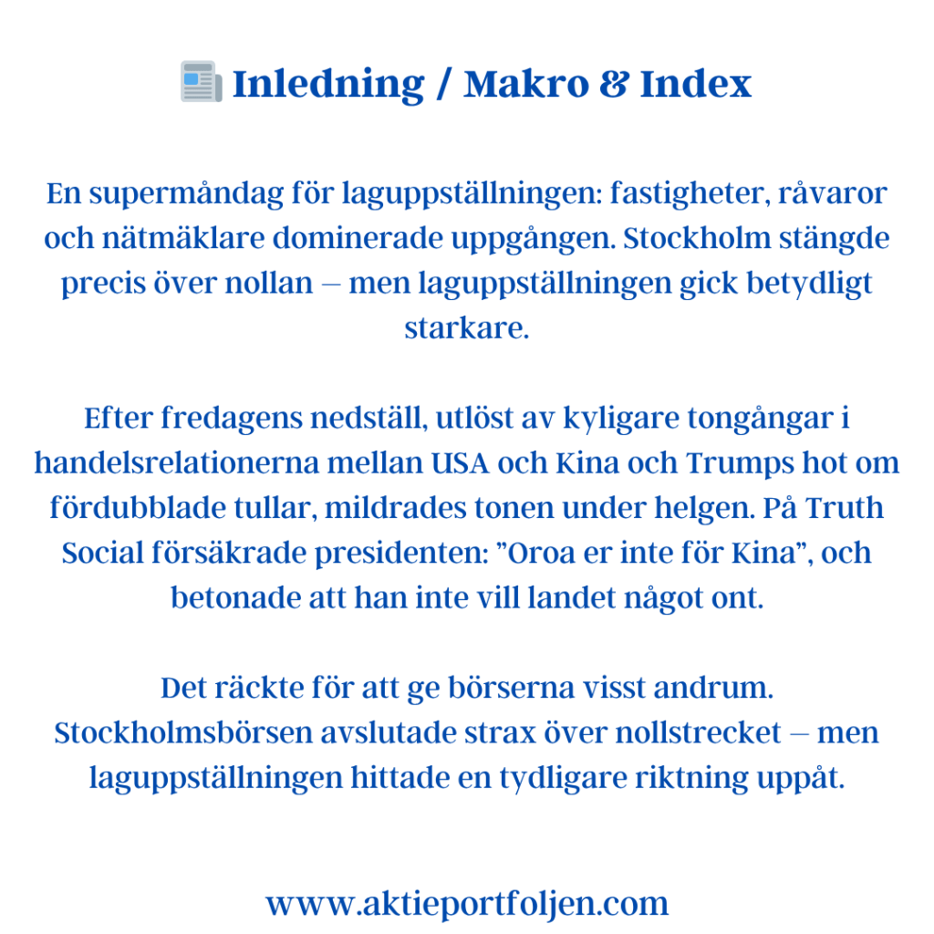 Securitas (+2,7 %) följde tätt efter sedan DNB Carnegie höjt riktkursen och upprepat köp. Analyshuset menar att bolaget är starkare och mer framtidssäkrat efter flera års marginalexpansion, kostnadsbesparingar och lyckade förvärv.