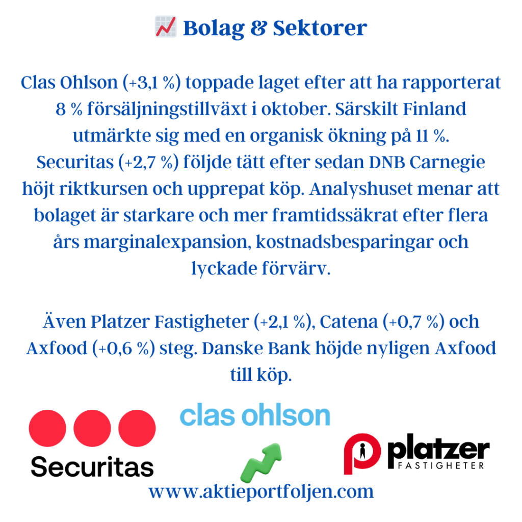 Clas Ohlson (+3,1 %) toppade laget efter att ha rapporterat 8 % försäljningstillväxt i oktober. Särskilt Finland utmärkte sig med en organisk ökning på 11 %.
