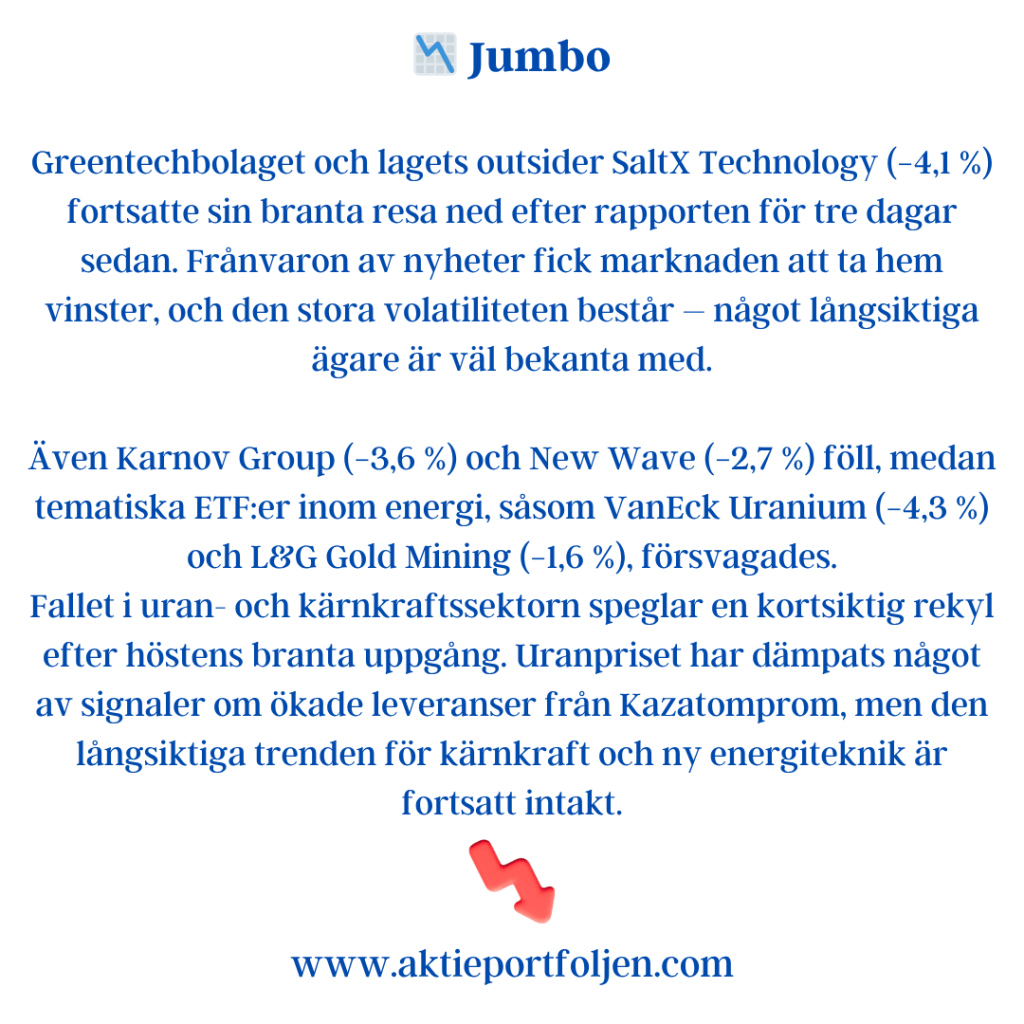 Fallet i uran- och kärnkraftssektorn speglar en kortsiktig rekyl efter höstens branta uppgång. Uranpriset har dämpats något av signaler om ökade leveranser från Kazatomprom, men den långsiktiga trenden för kärnkraft och ny energiteknik är fortsatt intakt.