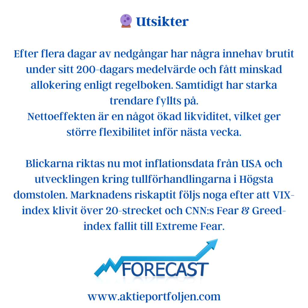 Blickarna riktas nu mot inflationsdata från USA och utvecklingen kring tullförhandlingarna i Högsta domstolen. Marknadens riskaptit följs noga efter att VIX-index klivit över 20-strecket och CNN:s Fear & Greed-index fallit till Extreme Fear.