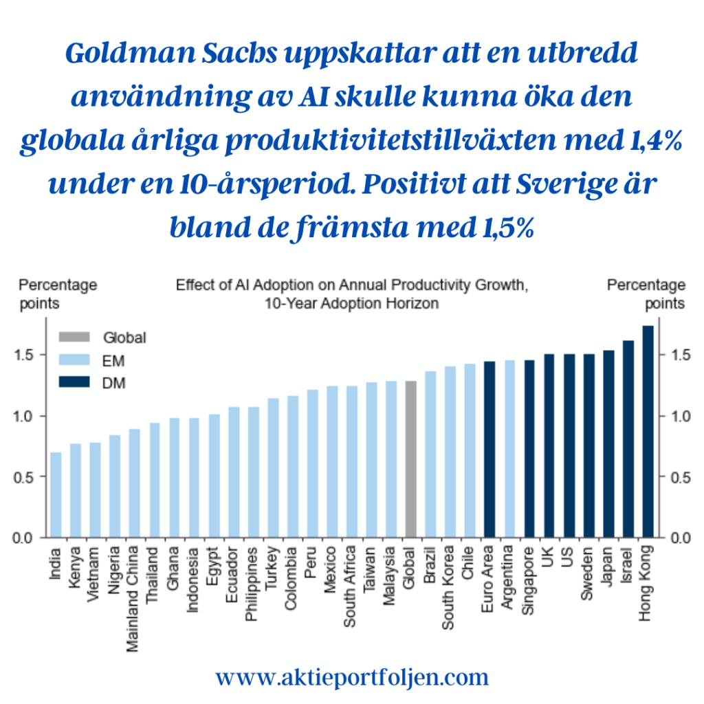 Goldman Sachs uppskattar att en utbredd användning av AI skulle kunna öka den globala årliga produktivitetstillväxten med 1,4% under en 10-årsperiod. Positivt att Sverige är bland de främsta med 1,5%.