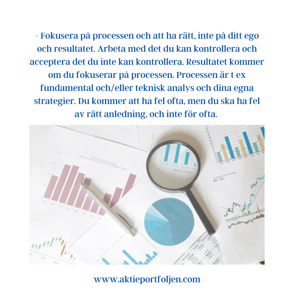 Är det möjligt att som investerare uppnå ett sinnestillstånd som inte påverkas av hur det går på börsen eller portföljen? Vi är bara människor så det är nog omöjligt att helt frånkoppla sinnestillståndet till hur det går på börsen. Däremot är det fullt möjligt att lära sig att hantera upp- och nedgångar så påverkan blir mindre. Här är några användbara tips: – Du är värd lika mycket oavsett hur börsen eller din egen portfölj utvecklas. Låt inte ditt egenvärde vara lika med dina prestationer, ett rus i uppgång är ganska kortsiktig. – Ta inte börsen och dig själv på för stort allvar. Försök se på skeendet utifrån ibland. Du är en fantastisk människa oavsett hur börsen går. – Fokusera på processen och att ha rätt, inte på ditt ego och resultatet. Arbeta med det du kan kontrollera och acceptera det du inte kan kontrollera. Resultatet kommer om du fokuserar på processen. Processen är t ex fundamental och/eller teknisk analys och dina egna strategier. Du kommer att ha fel ofta, men du ska ha fel av rätt anledning, och inte för ofta. – Sträva efter att förbättra livskvalitén hos andra. Engagera dig i ideella föreningar, familj och vänner. – Utveckla dig själv hela tiden. Fokuserar du på processen är börsen ett ständigt lärande både på macro och mikronivå. Titta inte för mycket på vad andra gör och undvik FOMO (”fear of missing out”, alltså att sparare och investerare köper aktier av rädsla för att missa en eventuell uppgång). Se till att bilda dig en egen uppfattning och ta egna beslut.