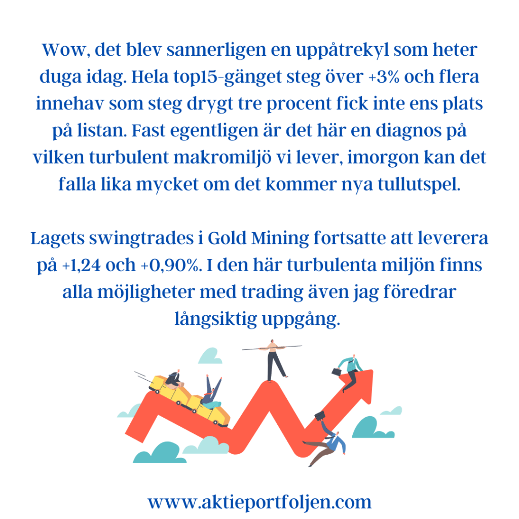 Andraplatsen tillföll guld-etf:en och guldet lyfts av all makroekonomisk oro. Jag har tre guld-relaterade etf:er i en större swingtrade och även iShares Gold Producers och L&G Goldmining kom med på top15 idag.