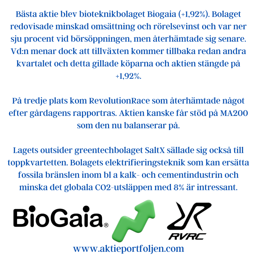 Bästa aktie blev bioteknikbolaget Biogaia (+1,92%). Bolaget redovisade minskad omsättning och rörelsevinst och var ner sju procent vid börsöppningen, men återhämtade sig senare. Vd:n menar dock att tillväxten kommer tillbaka redan andra kvartalet och detta gillade köparna och aktien stängde på +1,92%.