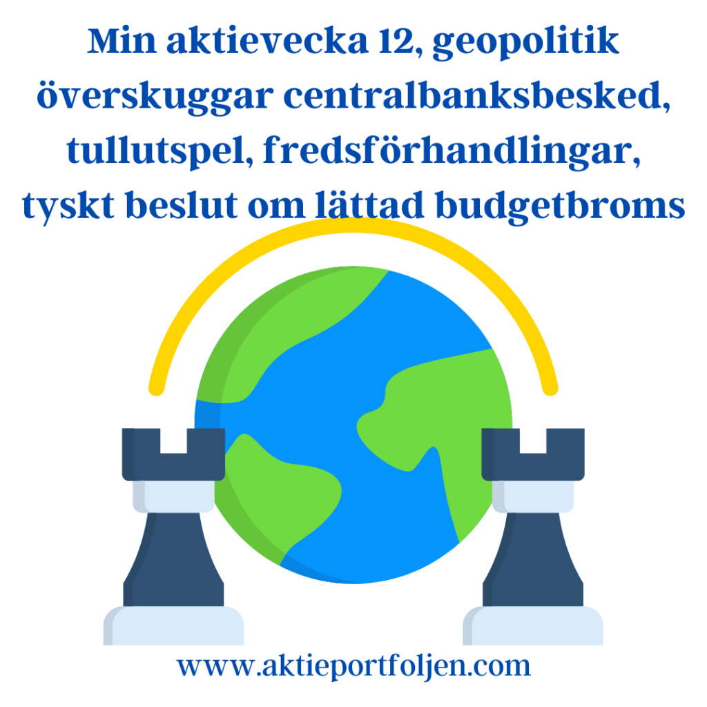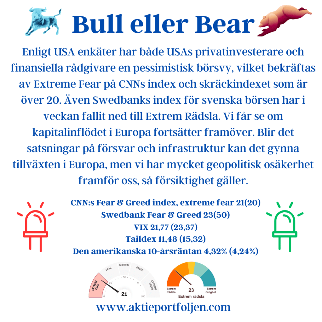 Enligt USA enkäter har både USAs privatinvesterare och finansiella rådgivare en pessimistisk börsvy, vilket bekräftas av Extreme Fear på CNNs index och skräckindexet som är över 20. Även Swedbanks index för svenska börsen har i veckan fallit ned till Extrem Rädsla. Vi får se om kapitalinflödet i Europa fortsätter framöver. Blir det satsningar på försvar och infrastruktur kan det gynna tillväxten i Europa, men vi har mycket geopolitisk osäkerhet framför oss, så försiktighet gäller.