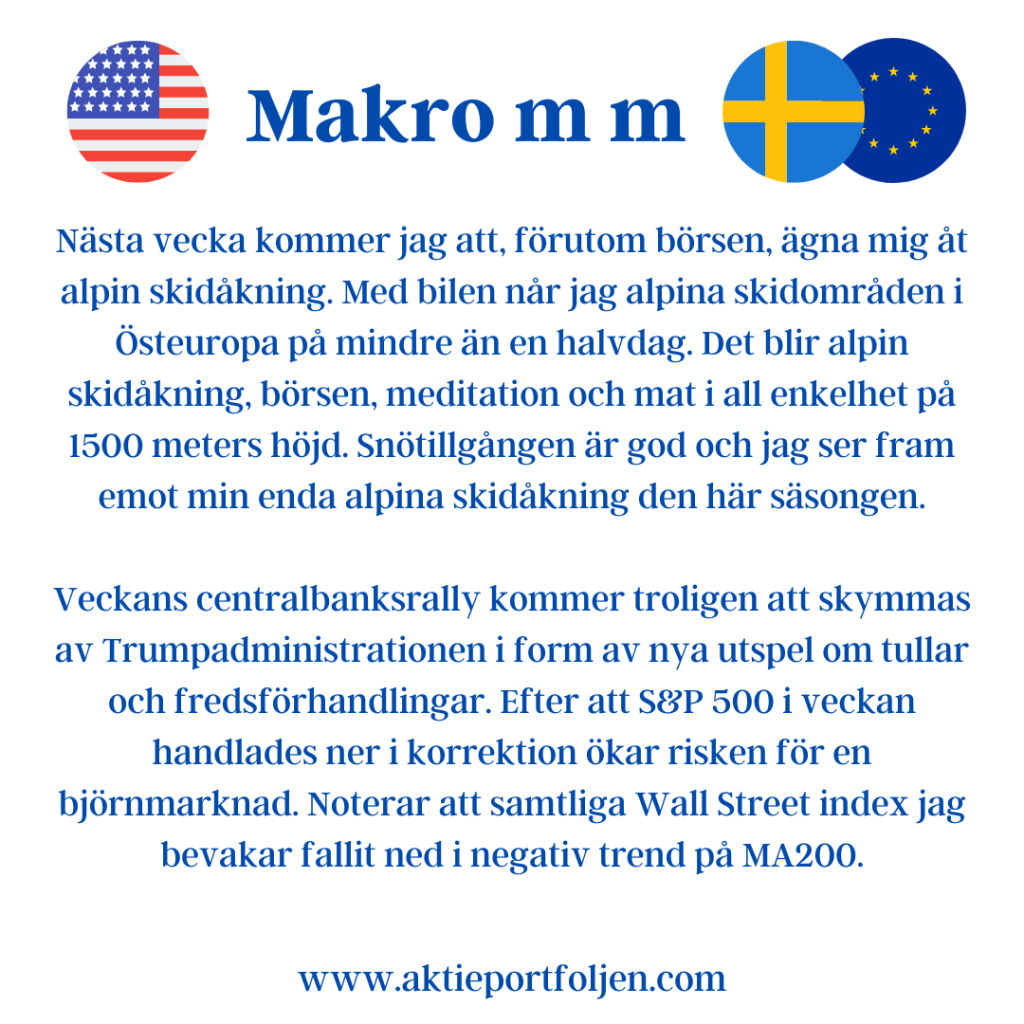 Veckans centralbanksrally kommer troligen att skymmas av Trumpadministrationen i form av nya utspel om tullar och fredsförhandlingar. Efter att S&P 500 i veckan handlades ner i korrektion ökar risken för en björnmarknad. Noterar att samtliga Wall Street index jag bevakar fallit ned i negativ trend på MA200.