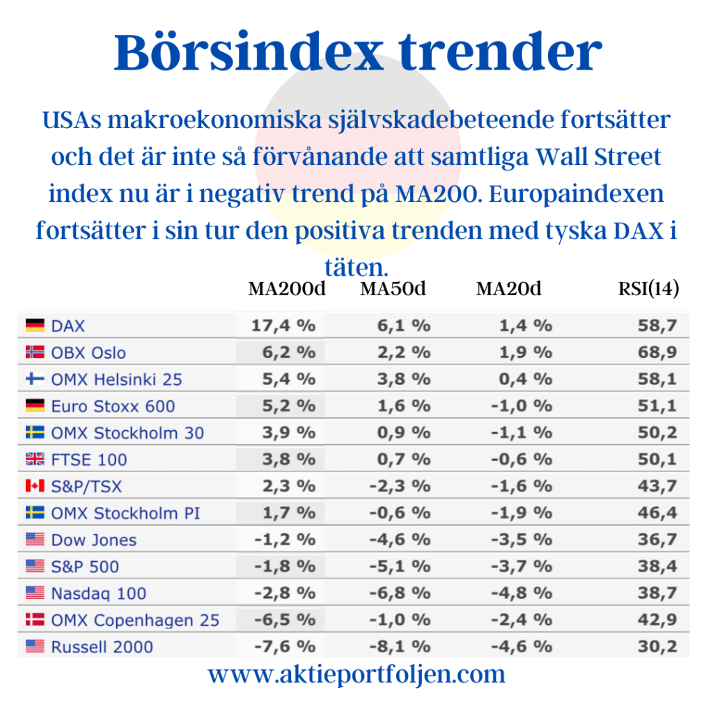 USAs makroekonomiska självskadebeteende fortsätter och det är inte så förvånande att samtliga Wall Street index nu är i negativ trend på MA200. Europaindexen fortsätter i sin tur den positiva trenden med tyska DAX i täten.