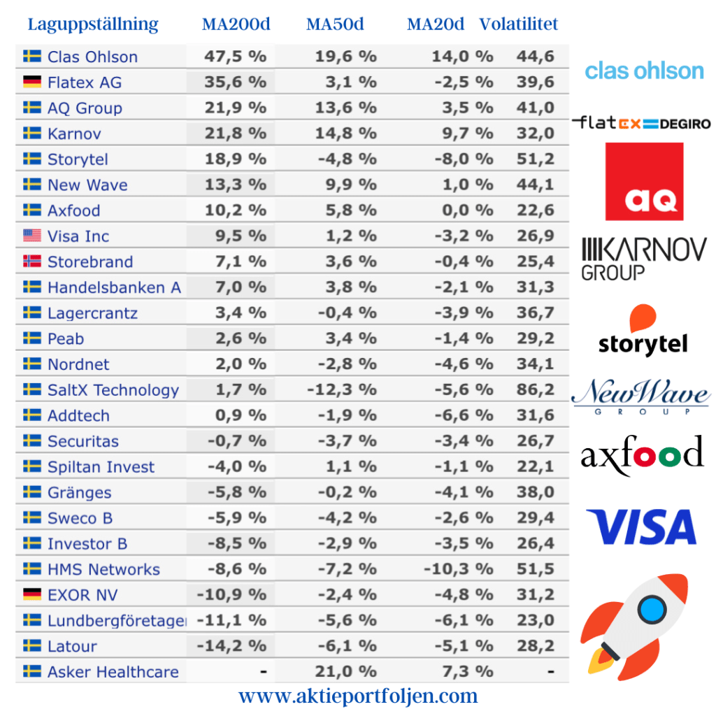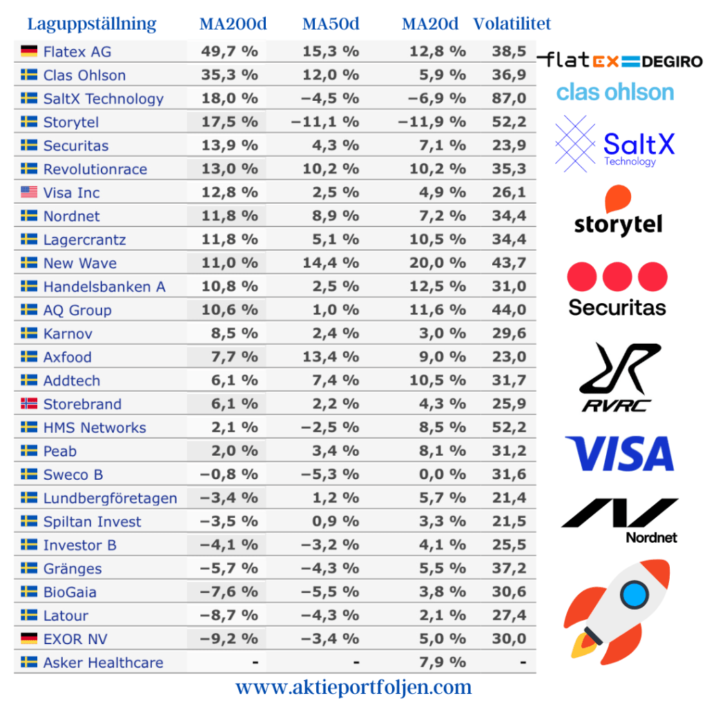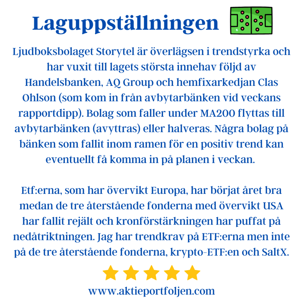 Ljudboksbolaget Storytel är överlägsen i trendstyrka och har vuxit till lagets största innehav följd av Handelsbanken, AQ Group och hemfixarkedjan Clas Ohlson (som kom in från avbytarbänken vid veckans rapportdipp). Bolag som faller under MA200 flyttas till avbytarbänken (avyttras) eller halveras. Några bolag på bänken som fallit inom ramen för en positiv trend kan eventuellt få komma in på planen i veckan.