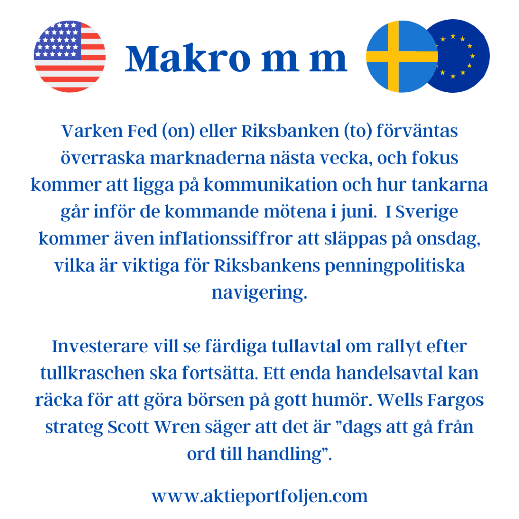 Varken Fed (on) eller Riksbanken (to) förväntas överraska marknaderna nästa vecka, och fokus kommer att ligga på kommunikation och hur tankarna går inför de kommande mötena i juni. I Sverige kommer även inflationssiffror att släppas på onsdag, vilka är viktiga för Riksbankens penningpolitiska navigering.