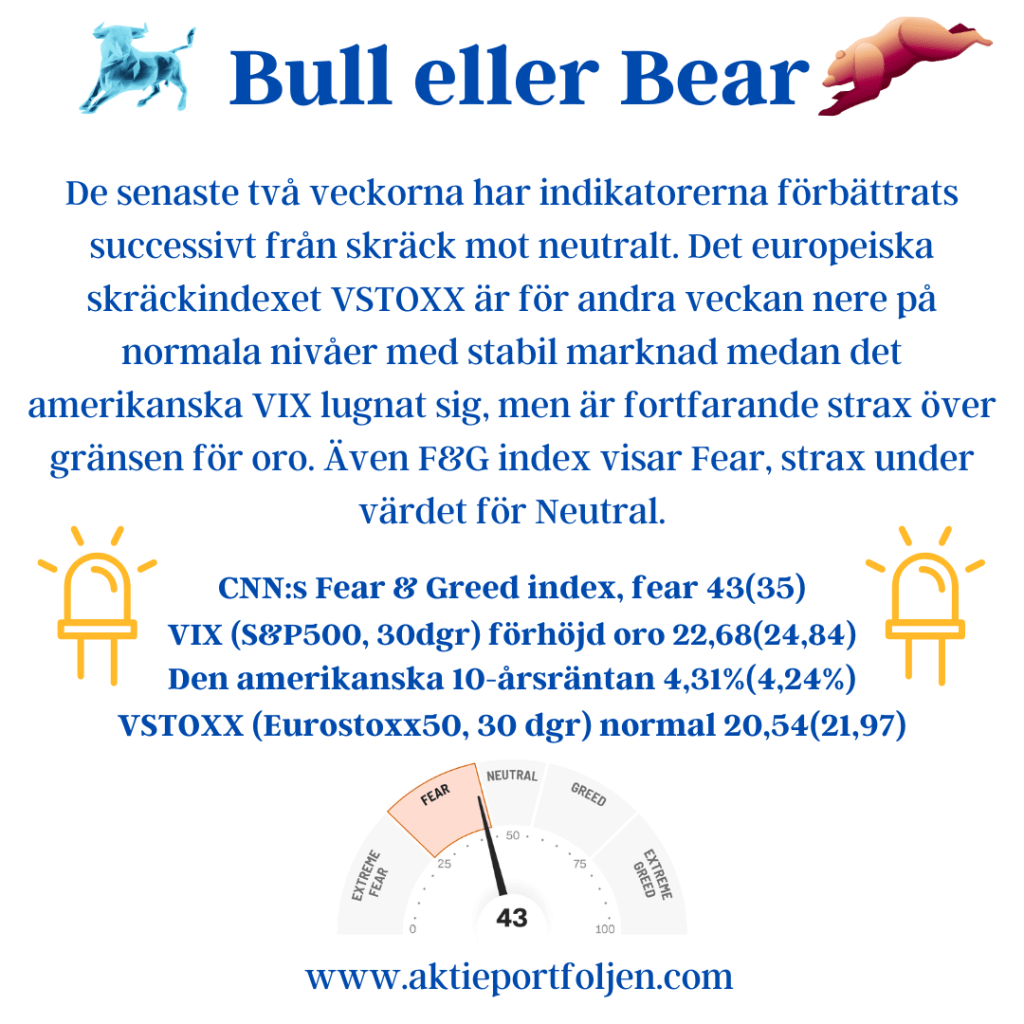 De senaste två veckorna har indikatorerna förbättrats successivt från skräck mot neutralt. Det europeiska skräckindexet VSTOXX är för andra veckan nere på normala nivåer med stabil marknad medan det amerikanska VIX lugnat sig, men är fortfarande strax över gränsen för oro. Även F&G index visar Fear, strax under värdet för Neutral.