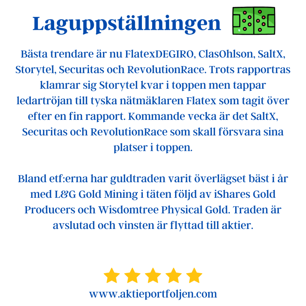 Bästa trendare är nu FlatexDEGIRO, ClasOhlson, SaltX, Storytel, Securitas och RevolutionRace. Trots rapportras klamrar sig Storytel kvar i toppen men tappar ledartröjan till tyska nätmäklaren Flatex som tagit över efter en fin rapport. Kommande vecka är det SaltX, Securitas och RevolutionRace som skall försvara sina platser i toppen.