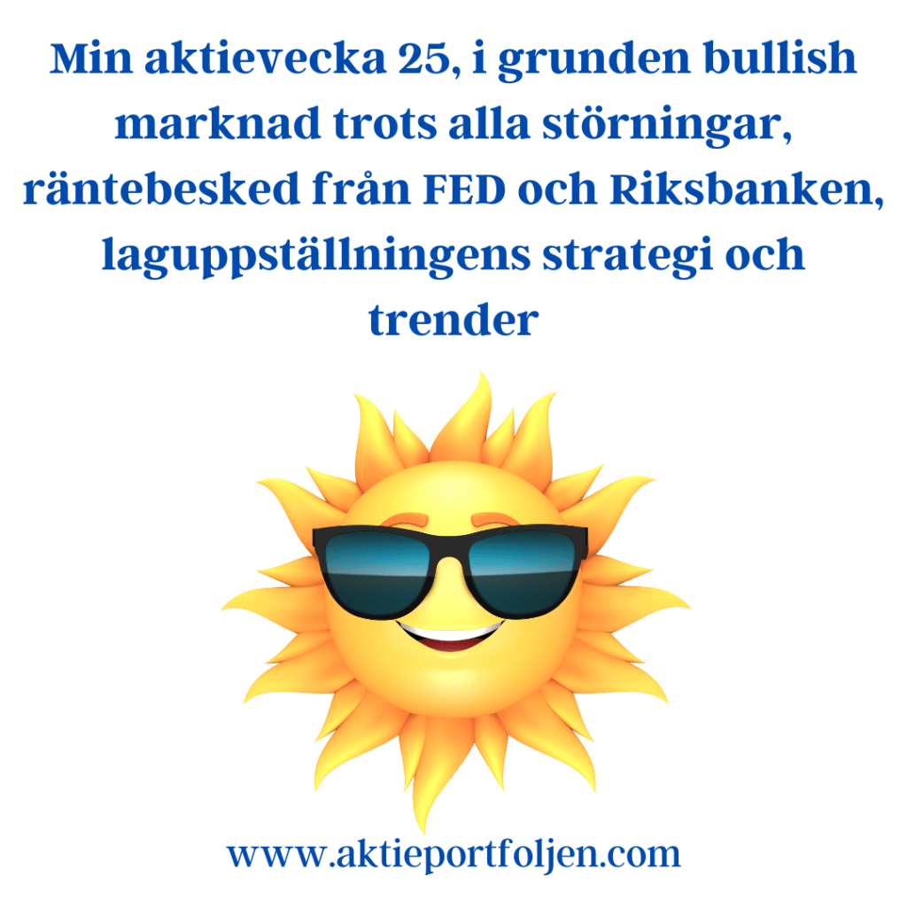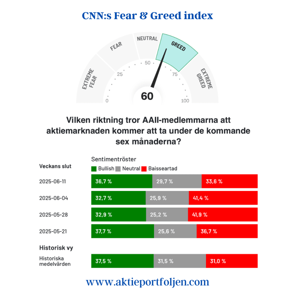 CNNs Fear & Greed index är kvar på Greed medan VIX har brutit över 20, vilket indikerar förhöjd oro med förväntan om en högre volatilitet. Europeiska VSTOXX är dock kvar inom det normala intervallet, där brytpunkten för ökad oro är 25.. Den senaste AAII-enkäten visar återigen på fler optimister än pessimister, men mätningen skedde innan konflikten eskalerade mellan Israel och Iran. Trots alla störningar är marknaden i grunden fortsatt bullish, och den som orkar härda ut smärtan vid nedgångar blir vinnare över tid.
