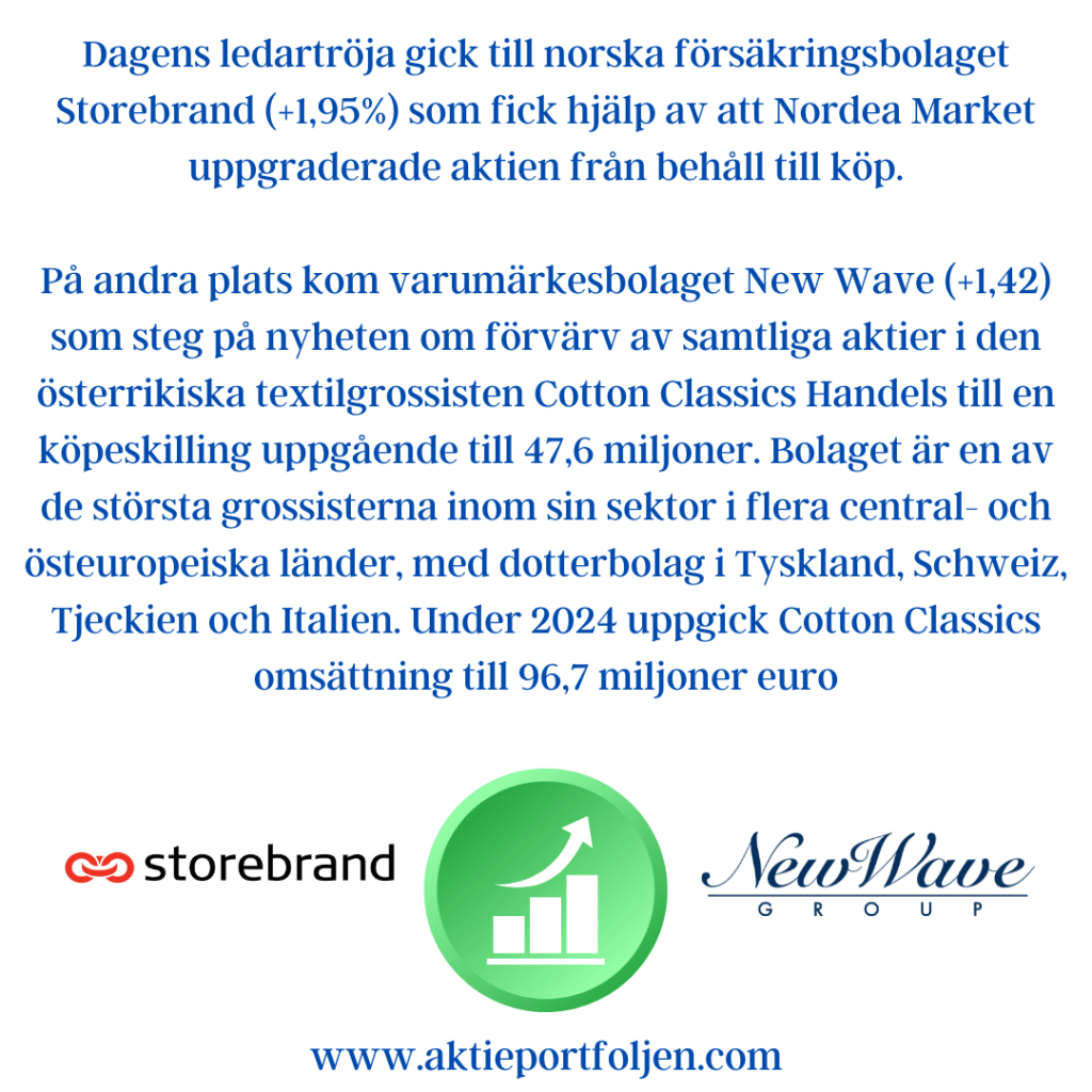 Dagens ledartröja gick till norska försäkringsbolaget Storebrand (+1,95%) som fick hjälp av att Nordea Market uppgraderade aktien från behåll till köp.