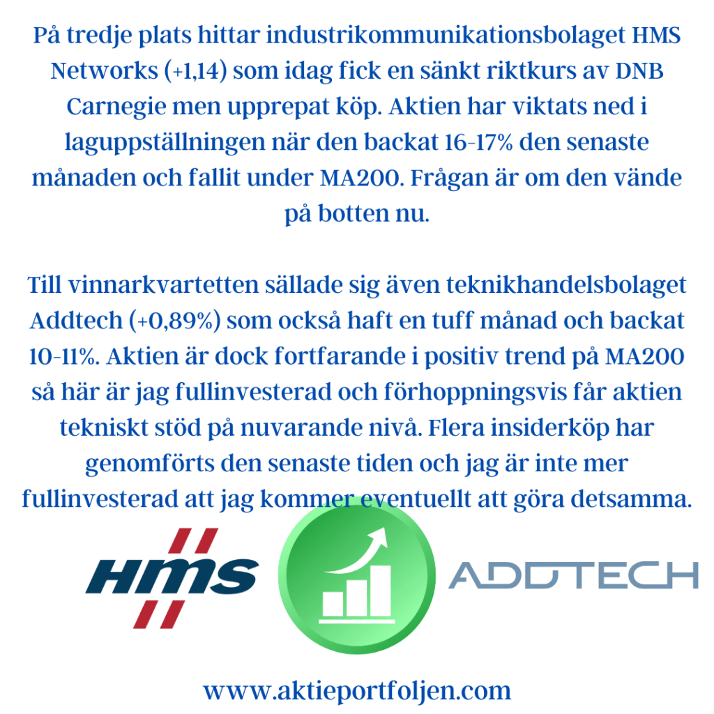 Till vinnarkvartetten sällade sig även teknikhandelsbolaget Addtech (+0,89%) som också haft en tuff månad och backat 10-11%. Aktien är dock fortfarande i positiv trend på MA200 så här är jag fullinvesterad och förhoppningsvis får aktien tekniskt stöd på nuvarande nivå. Flera insiderköp har genomförts den senaste tiden och jag är inte mer fullinvesterad att jag kommer eventuellt att göra detsamma.