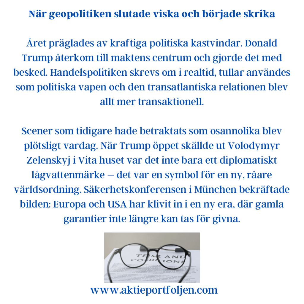 Ett märkligt år går mot sitt slut. Ett år där världspolitiken tidvis kändes mer improviserad än planerad, där geopolitiken tog förarsätet – och där marknaderna, mot alla odds, valde att blicka framåt snarare än bakåt.