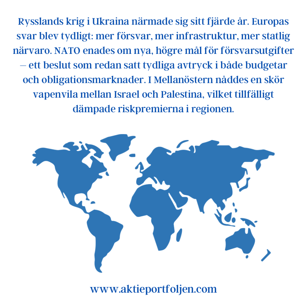 Rysslands krig i Ukraina närmade sig sitt fjärde år. Europas svar blev tydligt: mer försvar, mer infrastruktur, mer statlig närvaro. NATO enades om nya, högre mål för försvarsutgifter – ett beslut som redan satt tydliga avtryck i både budgetar och obligationsmarknader. I Mellanöstern nåddes en skör vapenvila mellan Israel och Palestina, vilket tillfälligt dämpade riskpremierna i regionen.
