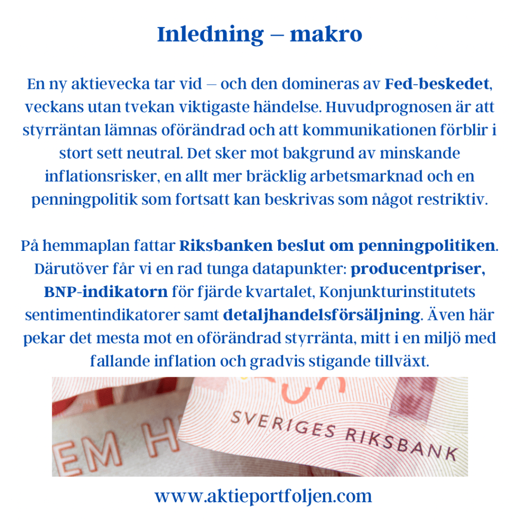 På hemmaplan fattar Riksbanken beslut om penningpolitiken. Därutöver får vi en rad tunga datapunkter: producentpriser, BNP-indikatorn för fjärde kvartalet, Konjunkturinstitutets sentimentindikatorer samt detaljhandelsförsäljning. Även här pekar det mesta mot en oförändrad styrränta, mitt i en miljö med fallande inflation och gradvis stigande tillväxt.