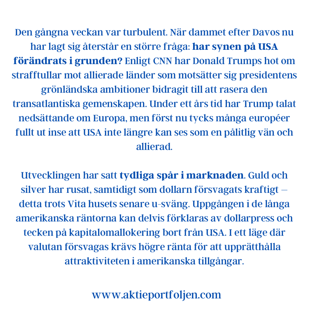 Utvecklingen har satt tydliga spår i marknaden. Guld och silver har rusat, samtidigt som dollarn försvagats kraftigt – detta trots Vita husets senare u-sväng. Uppgången i de långa amerikanska räntorna kan delvis förklaras av dollarpress och tecken på kapitalomallokering bort från USA. I ett läge där valutan försvagas krävs högre ränta för att upprätthålla attraktiviteten i amerikanska tillgångar.