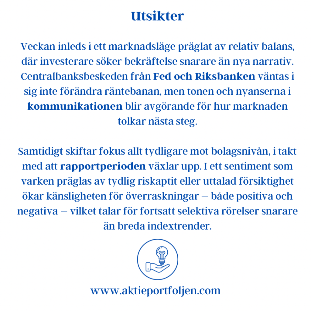 Veckan inleds i ett marknadsläge präglat av relativ balans, där investerare söker bekräftelse snarare än nya narrativ. Centralbanksbeskeden från Fed och Riksbanken väntas i sig inte förändra räntebanan, men tonen och nyanserna i kommunikationen blir avgörande för hur marknaden tolkar nästa steg.