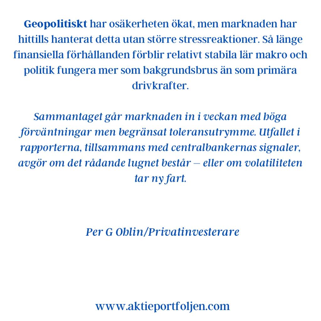 Geopolitiskt har osäkerheten ökat, men marknaden har hittills hanterat detta utan större stressreaktioner. Så länge finansiella förhållanden förblir relativt stabila lär makro och politik fungera mer som bakgrundsbrus än som primära drivkrafter.