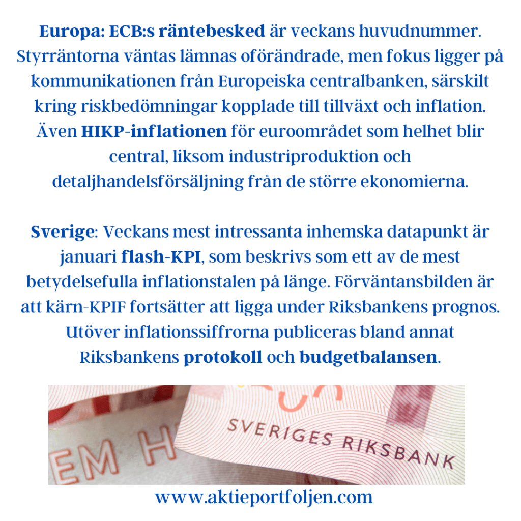 Veckans mest intressanta inhemska datapunkt är januari-blixt-KPI, som beskrivs som ett av de mest betydelsefulla inflationstalen på länge. Förväntansbilden är att kärn-KPIF fortsätter att ligga under Riksbanken prognos. Utöver inflationssiffrorna publiceras bland annat Riksbankens protokoll och budgetbalansen.