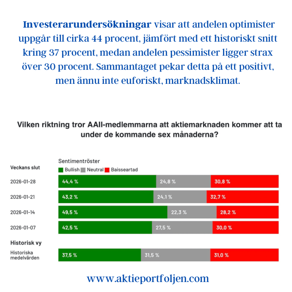 Globala sentimentmått ger en liknande, men något mer nyanserad bild. Det amerikanska Fear & Greed Index ligger runt 58, vilket signalerar girighet men inte extrema nivåer. Investerarundersökningar visar att andelen optimister uppgår till cirka 44 procent, jämfört med ett historiskt snitt kring 37 procent, medan andelen pessimister ligger strax över 30 procent. Sammantaget pekar detta på ett positivt, men ännu inte euforiskt, marknadsklimat.