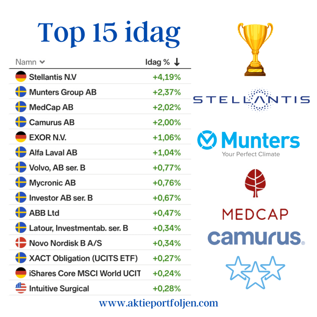 Klimatkontrollbolaget Munters håller ledartröjan tätt följd av medicinteknikbolaget Medcap. Det blir intressant att följa om Apples aktie får fortsatt styrka nu när trenden lyfte över MA200 och om Alleima, som fallit ned, får stöd och vänder uppåt. Nästa vecka ramlar det in fyra utdelningar och två bolag håller årsstämma. Jag planerar att besöka Spiltans årsstämma den 18 maj. Det verkar lovande att Spiltan själva hälsar aktieägarna välkomna till Sveriges förmodligen trevligaste årsstämma som hålls på Cirkus i Stockholm. Det blir seminarier, frågestund, lunch, fika och formell stämma.