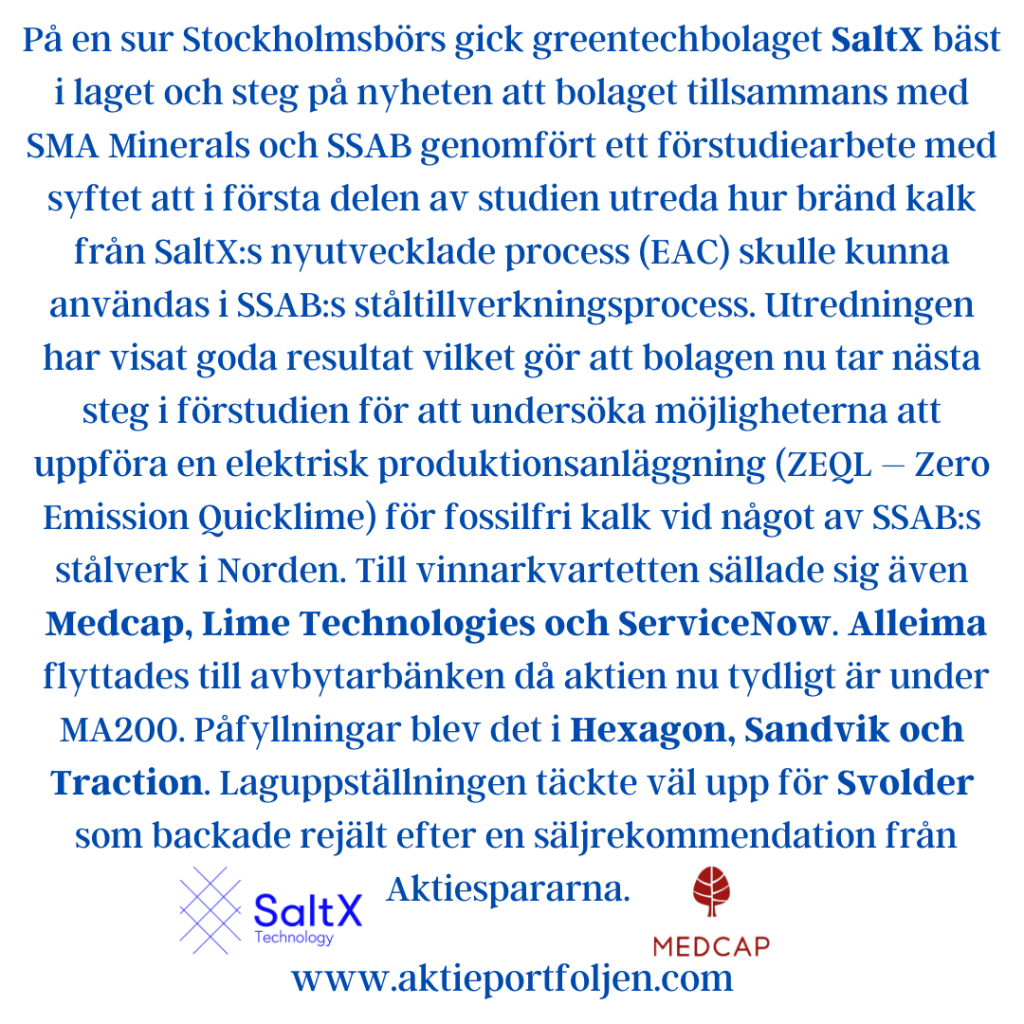 På en sur Stockholmsbörs gick greentechbolaget SaltX bäst i laget och steg på nyheten att bolaget tillsammans med SMA Minerals och SSAB genomfört ett förstudiearbete med syftet att i första delen av studien utreda hur bränd kalk från SaltX:s nyutvecklade process (EAC) skulle kunna användas i SSAB:s ståltillverkningsprocess. Utredningen har visat goda resultat vilket gör att bolagen nu tar nästa steg i förstudien för att undersöka möjligheterna att uppföra en elektrisk produktionsanläggning (ZEQL – Zero Emission Quicklime) för fossilfri kalk vid något av SSAB:s stålverk i Norden.