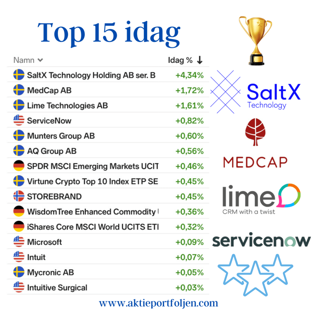 Till vinnarkvartetten sällade sig även Medcap, Lime Technologies och ServiceNow. Alleima flyttades till avbytarbänken då aktien nu tydligt är under MA200.
