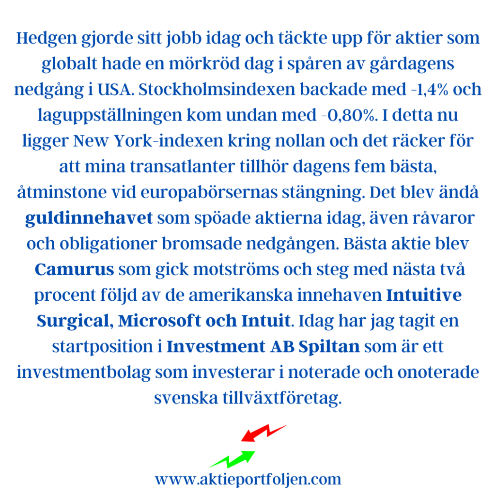 Hedgen gjorde sitt jobb idag och täckte upp för aktier som globalt hade en mörkröd dag i spåren av gårdagens nedgång i USA. Stockholmsindexen backade med -1,4% och laguppställningen kom undan med -0,80%. I detta nu ligger New York-indexen kring nollan och det räcker för att mina transatlanter tillhör dagens fem bästa, åtminstone vid europabörsernas stängning. Det blev ändå guldinnehavet som spöade aktierna idag, även råvaror och obligationer bromsade nedgången. Bästa aktie blev Camurus som gick motströms och steg med nästa två procent följd av de amerikanska innehaven Intuitive Surgical, Microsoft och Intuit. Idag har jag tagit en startposition i Investment AB Spiltan som är ett investmentbolag som investerar i noterade och onoterade svenska tillväxtföretag.