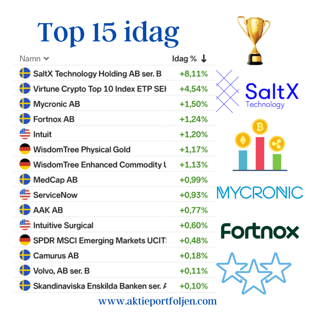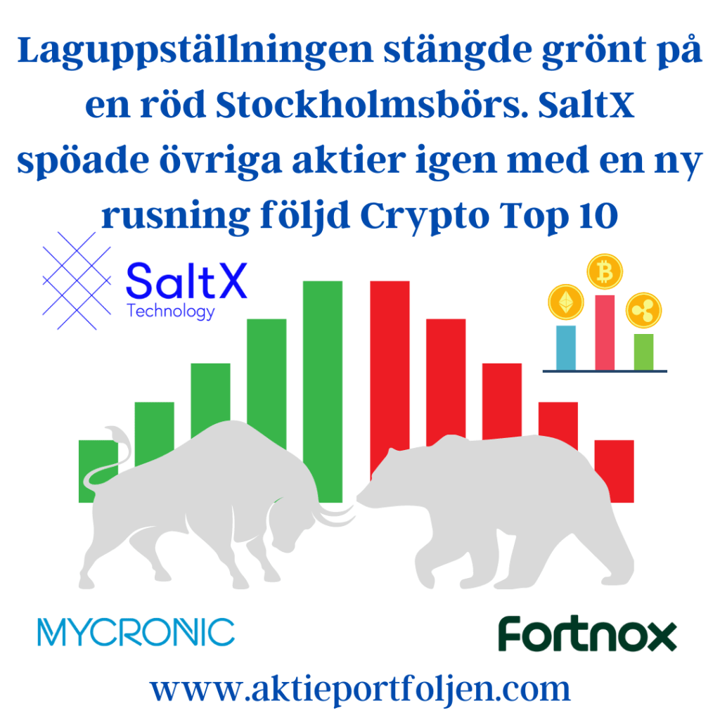 Laguppställningen stängde på grönt med KF i täten som stängde på +0,30% medan Stockholmsindexen stängde på rött omkring -0,25%. Greentechbolaget SaltX toppar återigen med en rusning på +8,11% efter flera positiva resultat kring bolagets nyutvecklade elektrifieringsteknik. På andra plats stängde Virtune Crypto Top 10 som ger exponering mot de 10 ledande kryptovalutorna. På tredje och fjärde plats kom mönsterritarbolaget Mycronic och affärssystembolaget Fortnox som båda steg bra utan direkta nyheter. Imorgon ser jag fram emot att besöka investmentbolaget Spiltan Investsårsstämma. Före stämman blir det flera föredrag och filmvisning. Noterar också att på måndag växlar Spiltans aktie över från endagarshandel på tisdagar till handel varje handelsdag när aktien flyttas till NGM:s huvudlista.