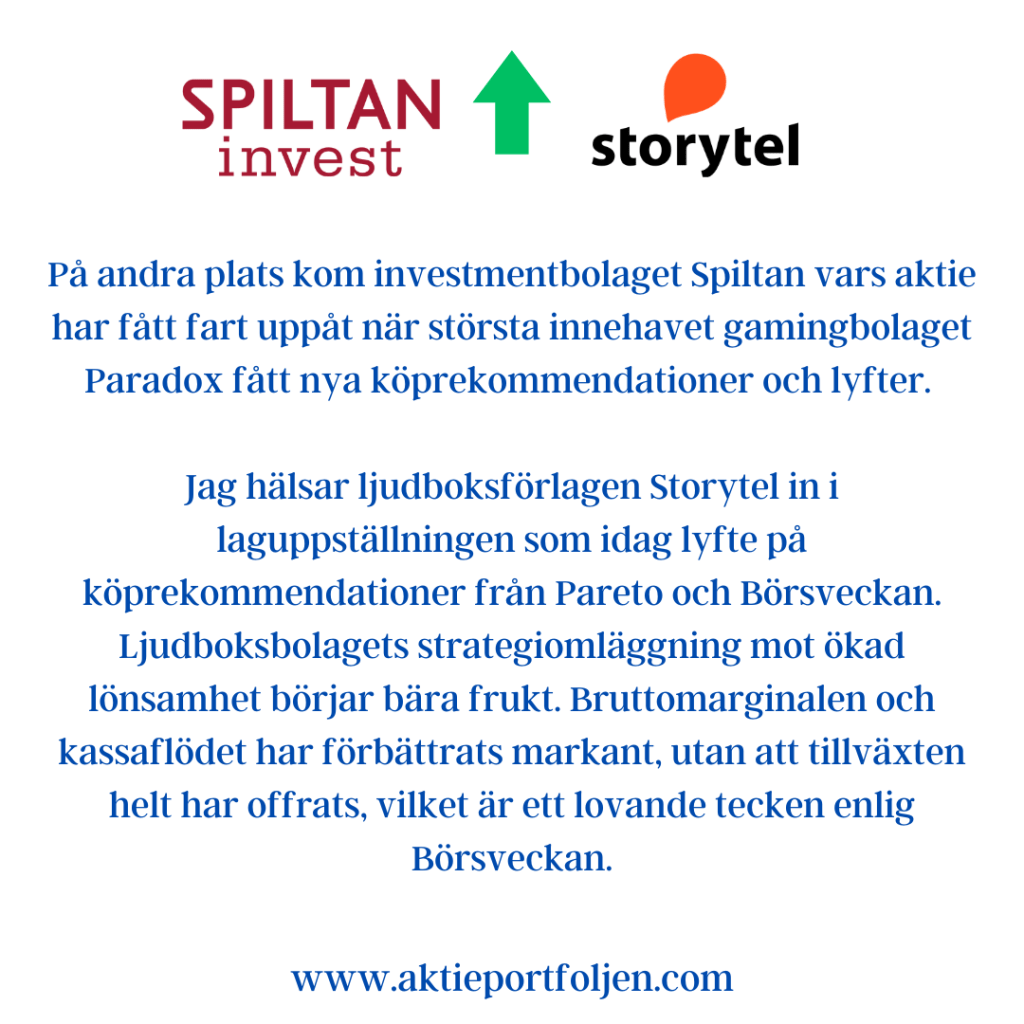 Trean Storytel (+3,09%) steg på nyheten att ljudboksförlaget köper ytterligare ett svenskt förlag med flera mycket populära författare och hög vinstmarginal. Den här gången handlar det om höglönsamma Bokfabriken. Storytel köper 70 procent av aktierna i förlaget som under 2023 omsatte 66 miljoner kronor och gjorde en vinst på 16 miljoner. Den digitala distributionen, med över 500 ljudböcker, stod för mer än 70 procent av intäkterna skriver Breakit.