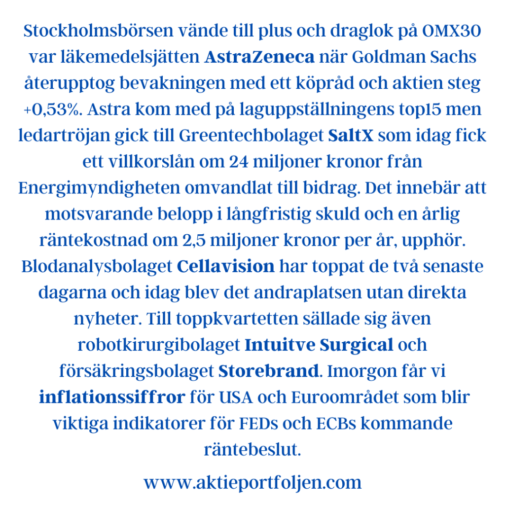 Greentechbolaget SaltX var laguppställningens andra rapportör idag. Bolaget har nyligen gjort ett viktigt genombrott i sin teknik och största ägaren och partnern SMA Mineral har fått 287 miljoner norska kronor i statligt norskt bidrag för att uppföra en anläggning i Norge där SaltX teknik kommer att användas. SaltX har även krokat arm med Thyssenkrupp Polysius som vill använda SaltX elektrifieringsteknik för att utveckla utsläppsfri kalk- och cementproduktion. SaltX backade idag med -1,92%, men har i år redan stigit med +57%.