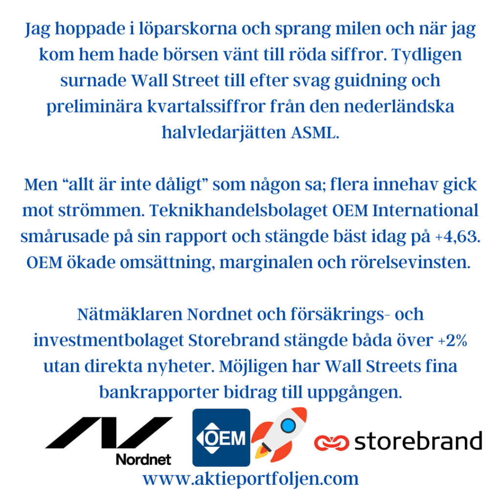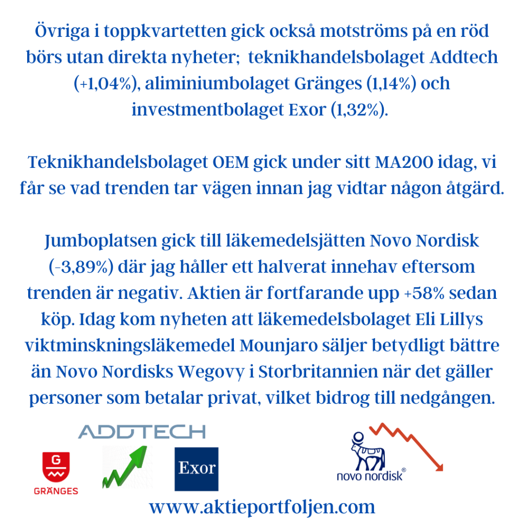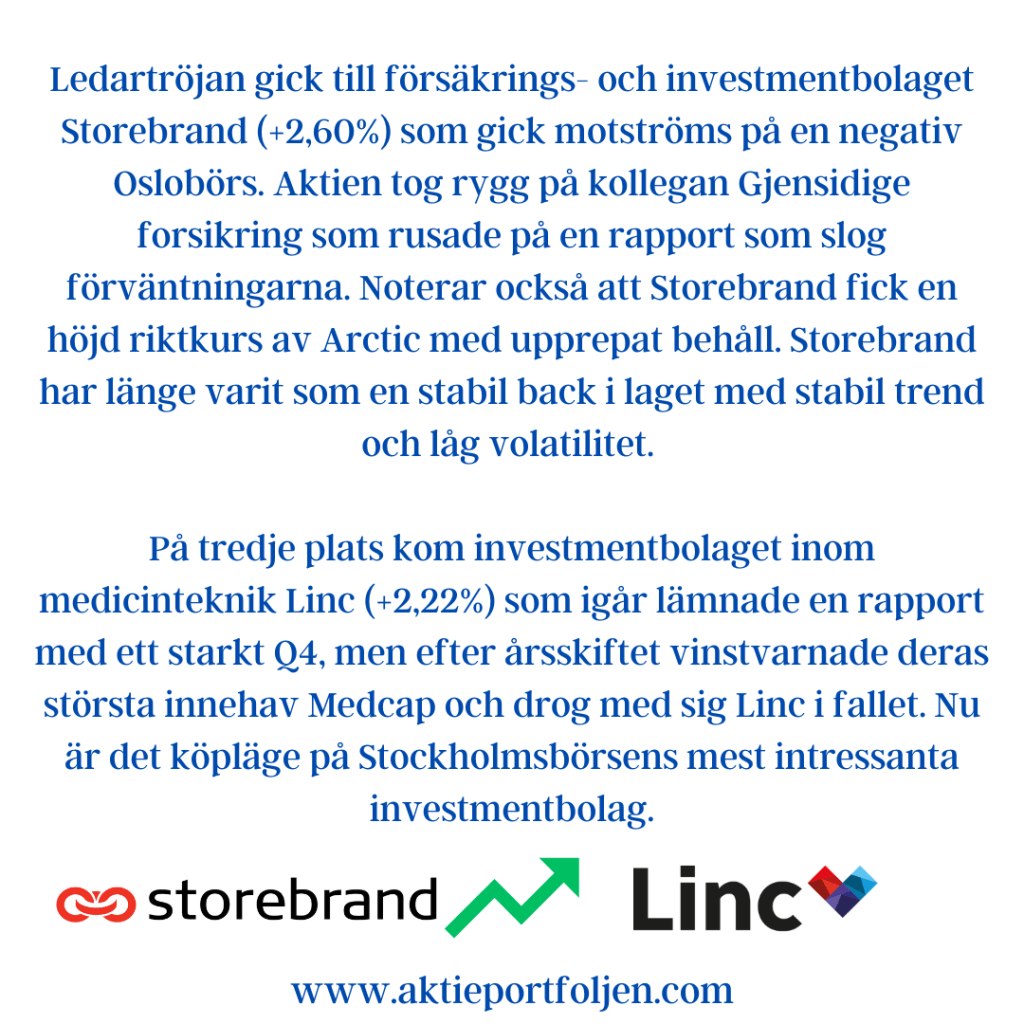 Ledartröjan gick investmentbolaget AJ Ahlström (+2,34%) som redovisade ökat substansvärde och höjer utdelningen. ”Sammantaget ser vi positivt på utsikterna för våra bolag under 2025” skriver VDn.