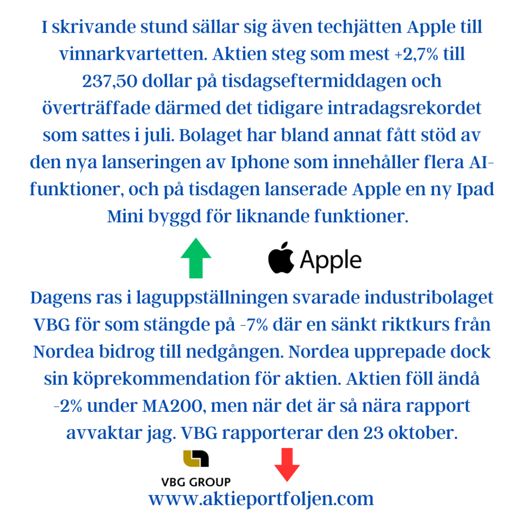 Flera innehav i laguppställningen gick motströms och hela top15 stängde på grönt.