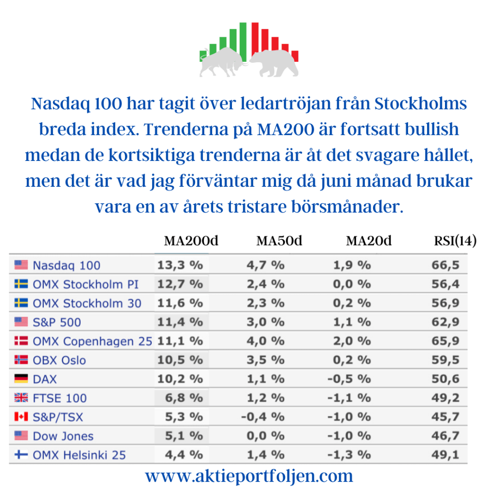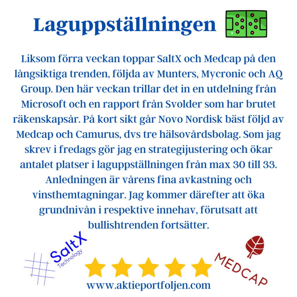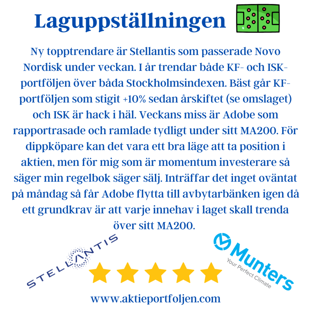 Idag var det dags för en rejäl städning i portföljen. AstraZeneca, Gränges och iShares MSCI Europe Consumer Staples ETF fick flytta till avbytarbänken. Alla tre har tappat styrfarten och trendat tydligt under sitt 200-dagars medelvärde, vilket gjort att jag agerade. In i laget plockade jag istället in tech-bolagen Mycronic och Addnode. Dessutom passade jag på att fylla på i Hexagon, som hittills bara varit en bevakningspost.